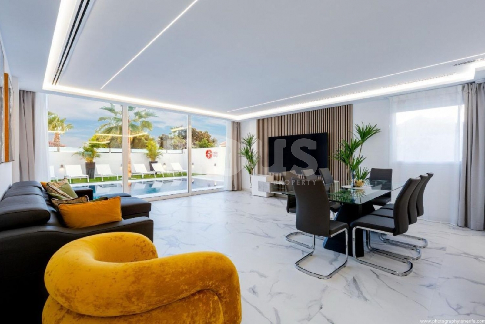 Diese auf einer Etage erbaute Villa kombiniert moderne Designstrukturen mit sorgfältigen Details. Genießen Sie Komfort mit einem Hausautomationssystem, mit dem Sie Beleuchtung und Videoüberwachung von überall aus steuern können.