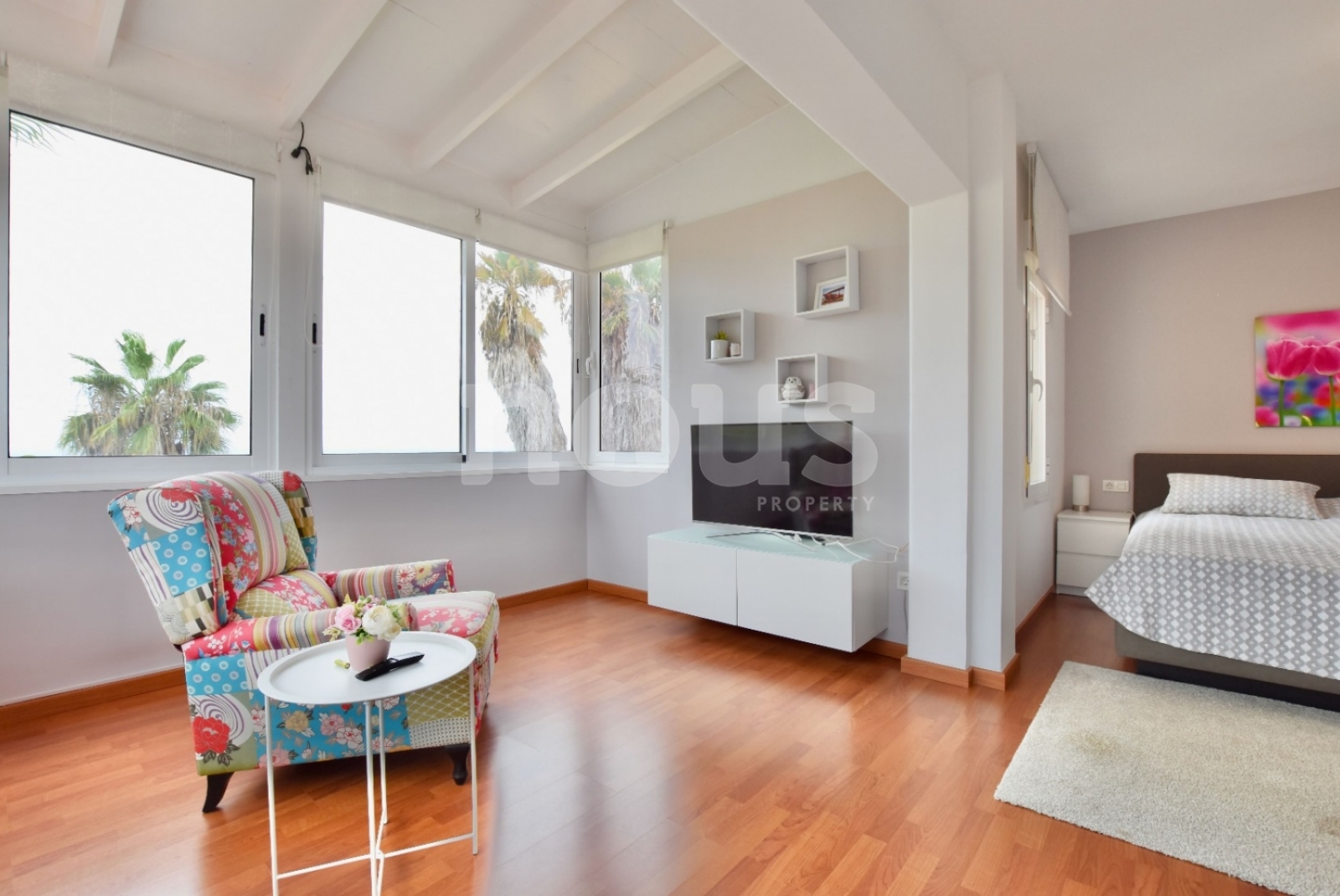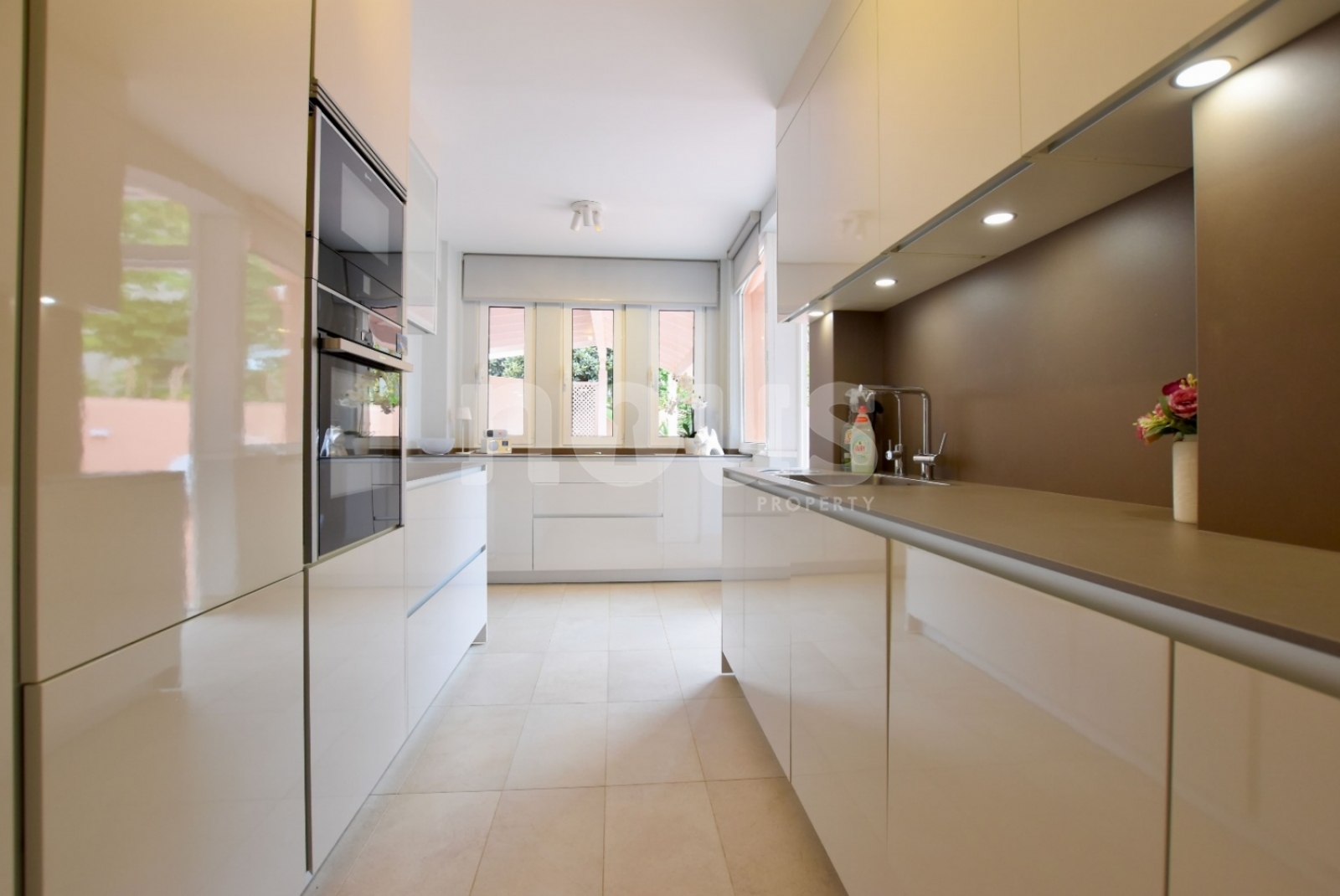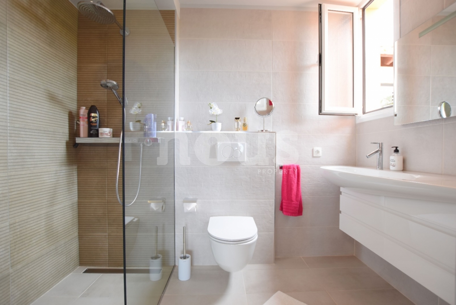 Im Erdgeschoss befindet sich ein großes Wohnzimmer mit Dachbodenfenstern, die einen Blick auf das Meer, den Garten und die Terrasse bieten, unabhängige Designküche mit hochwertigen Oberflächen, Höflichkeitsreinigung, Wäsche und Speisekammer.