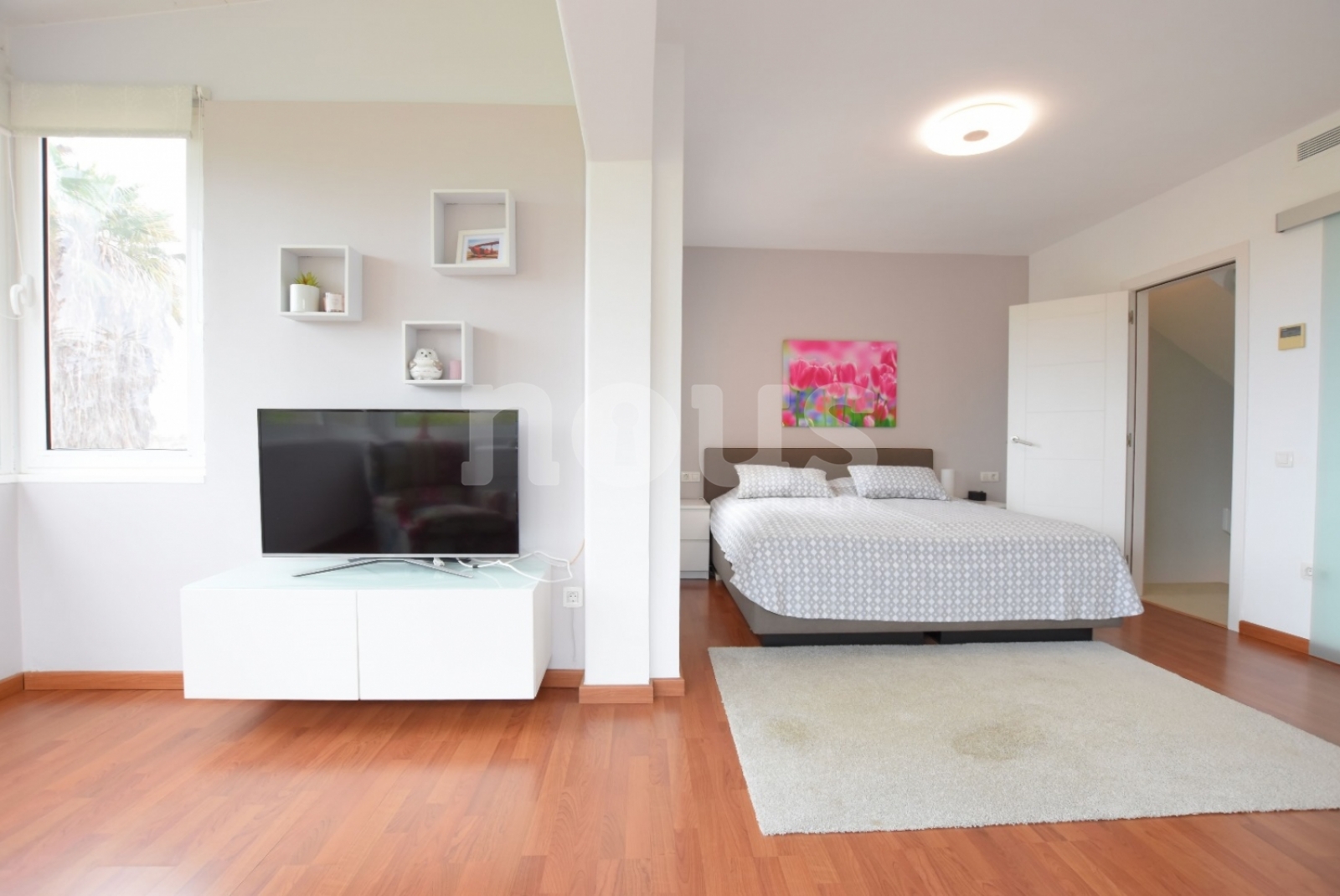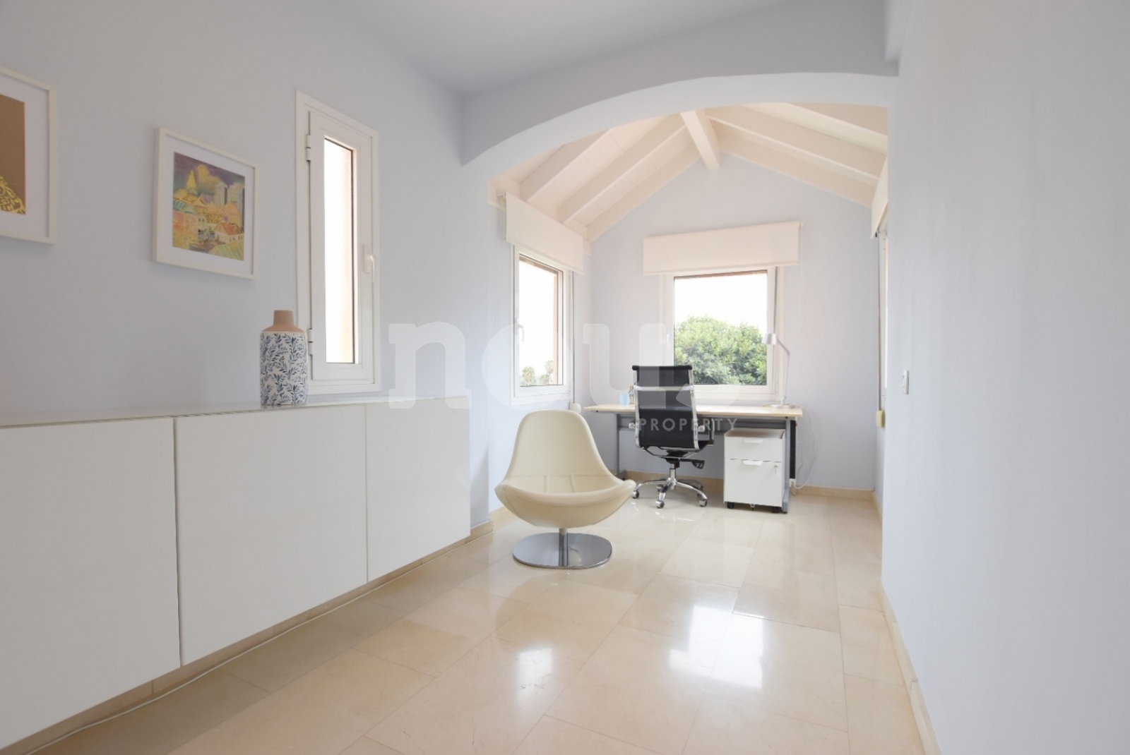 Im Obergeschoss befindet sich die Hauptsuite mit einer privaten Lounge, einem spektakulären Blick auf das Meer und dem Golfplatz, dem Suite -Badezimmer, dem Ankleidezimmer und dem überfüllten Schrank. Das zweite Schlafzimmer ist doppelt und verfügt über einen gebauten Schrank, während das dritte, der derzeit als Versand verwendet wird, ideal als Gästezimmer, Kinderzimmer oder kreativen Raum ist. In dieser Anlage gibt es auch zwei Badezimmer und eine Höflichkeitstoilette.