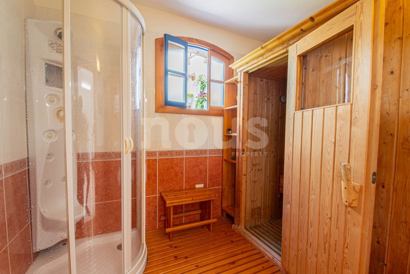 Die Villa bietet Erholungsbereiche wie einen privaten Fitnessraum mit Sauna, einen von einer Liegewiese umgebenen Swimmingpool und eine Grilletage mit einer voll ausgestatteten Küche, einem Holzofen und zwei Badezimmern, die sich in einer natürlichen Höhle befinden und einen einzigartigen Raum zum Genießen schaffen. der Natur.