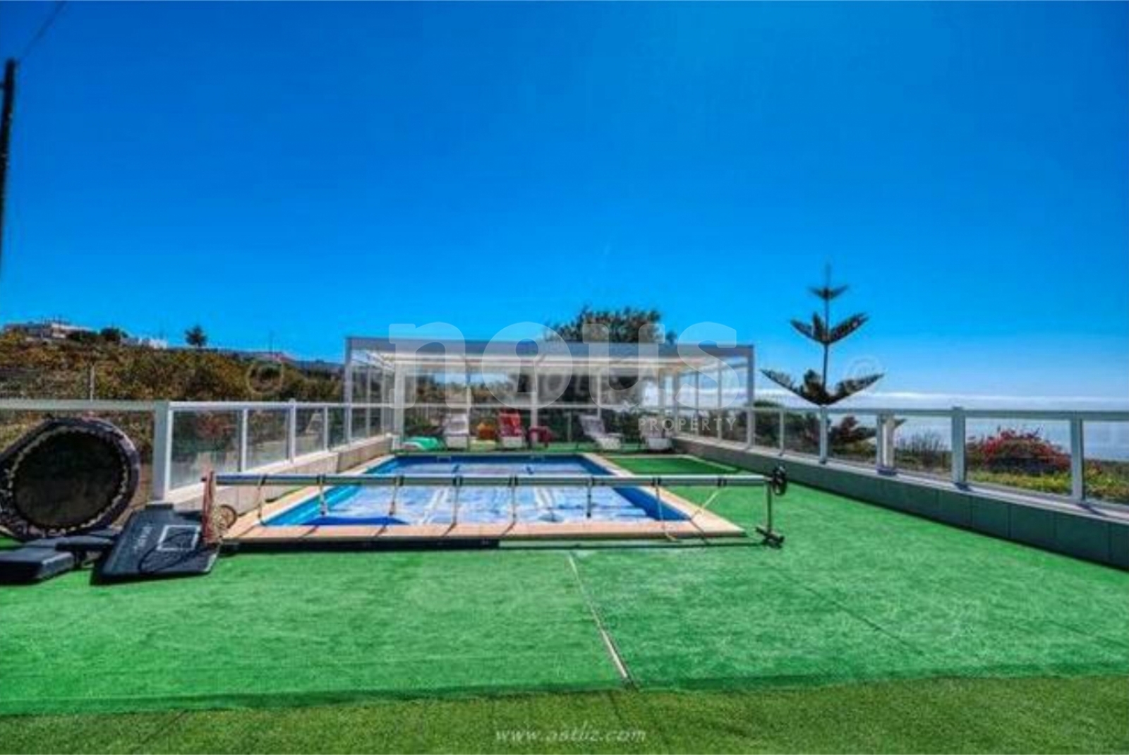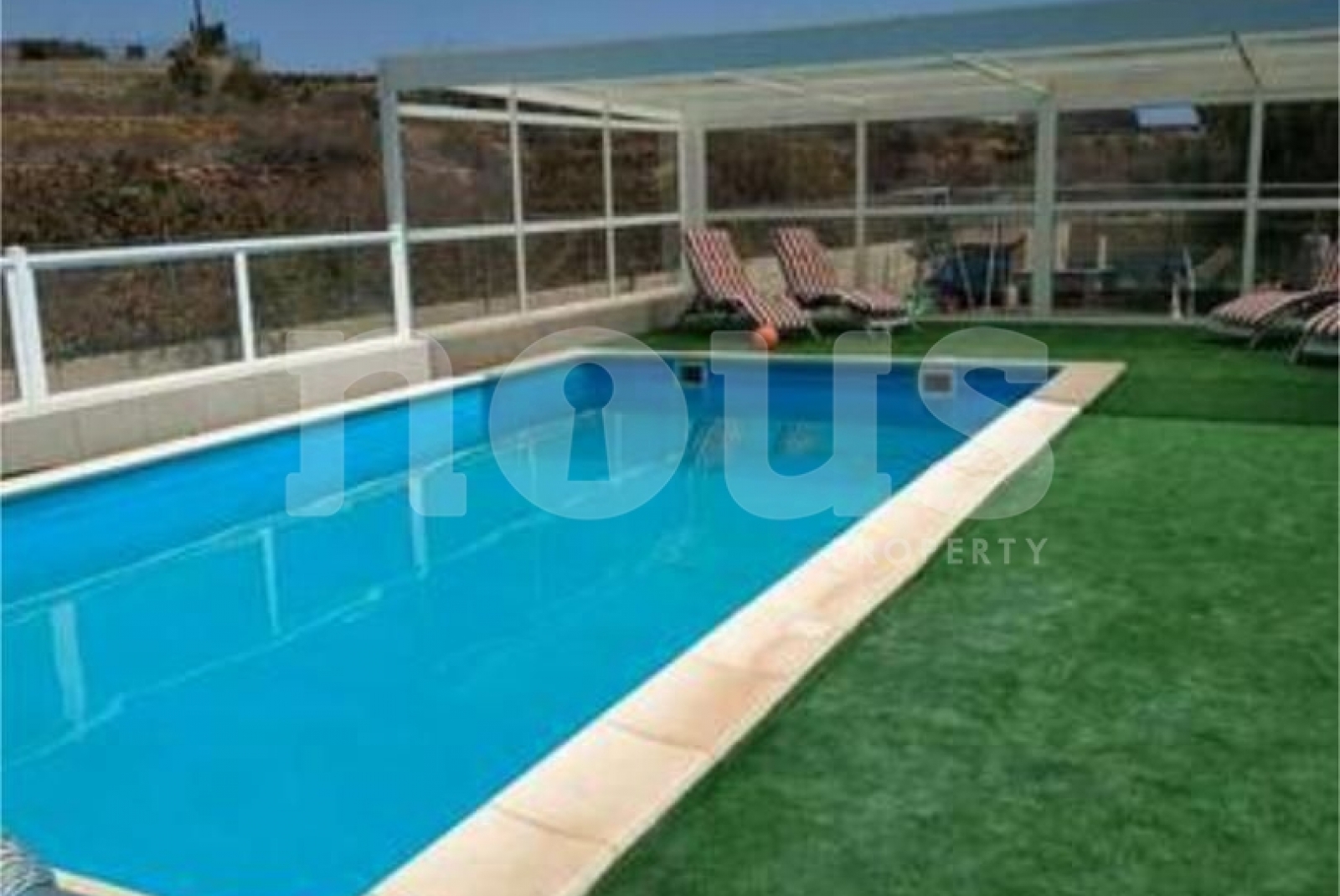 - 32 m² Pool mit Pergola und Sonnenliegen.