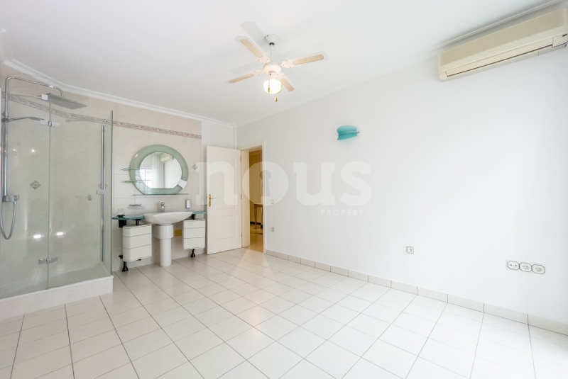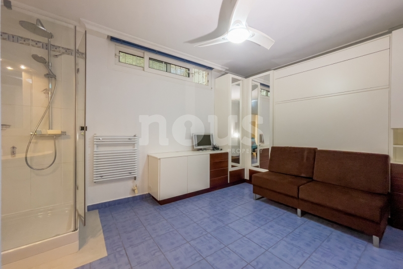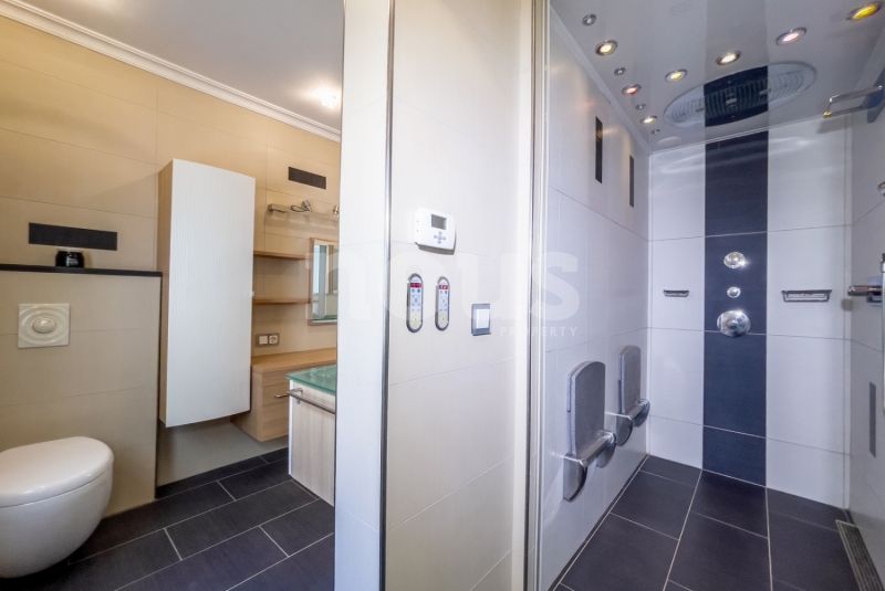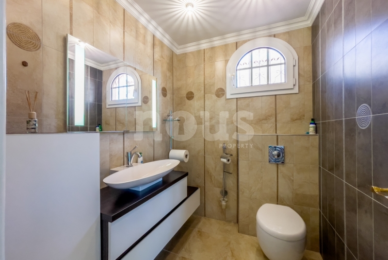On the ground floor, a hallway with a built-in wardrobe leads to a toilet, and three bedrooms, two of which have access to the lower terrace. The master suite has its own dressing room, bathroom with shower and hammam sauna. The villa also has a large garage with closets, a laundry room and a refrigerated cellar.