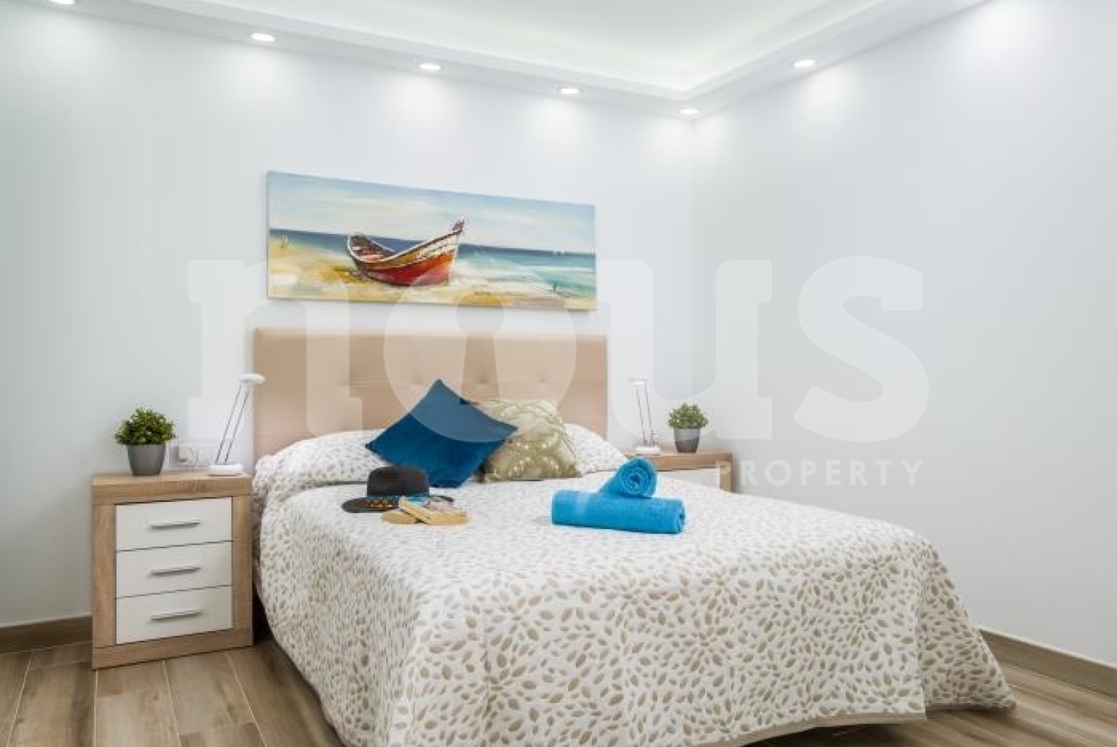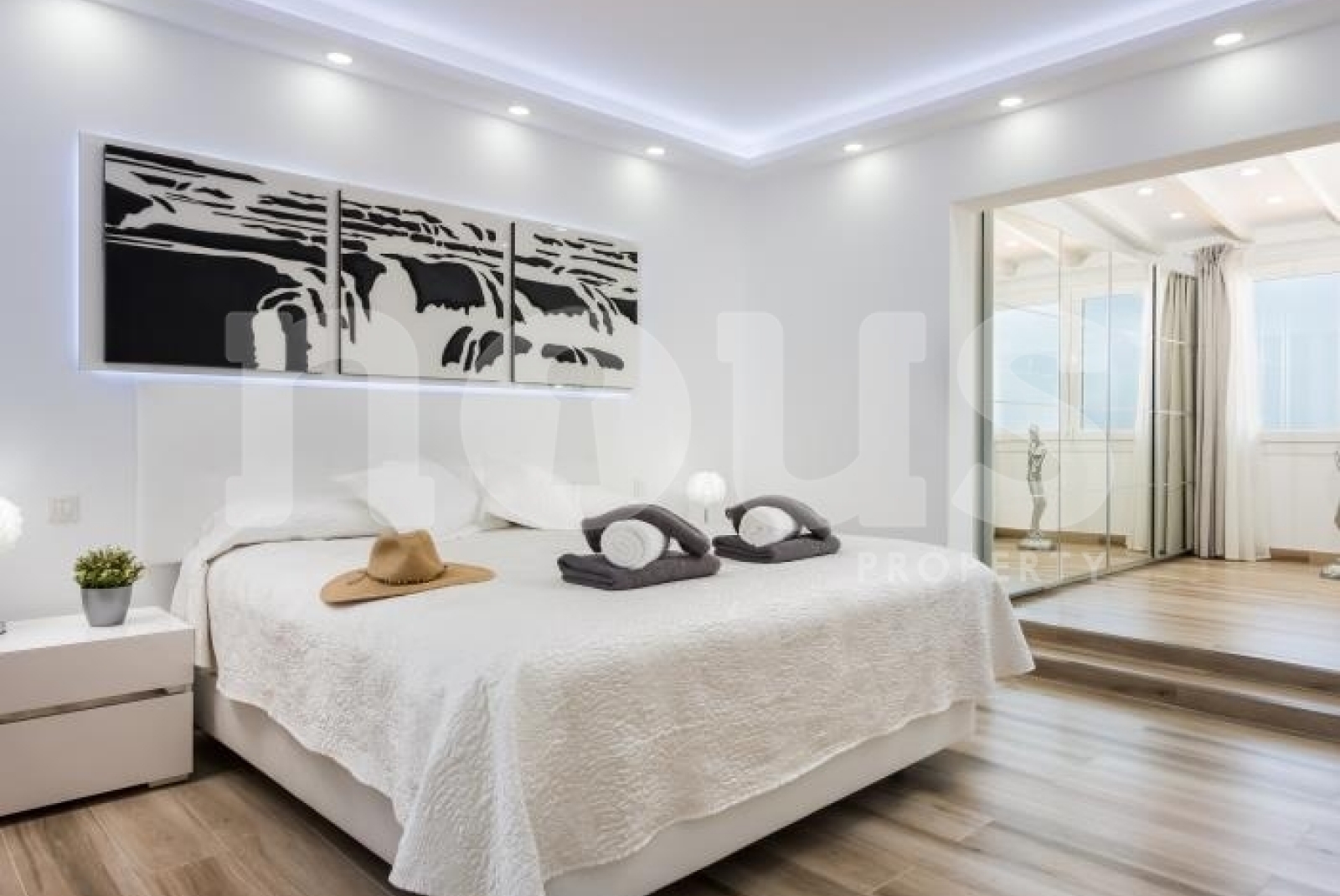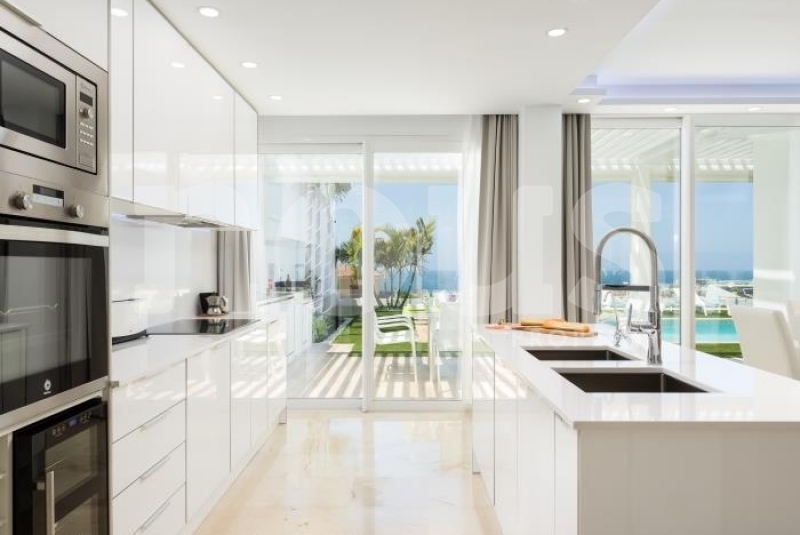 The windows offer views of the sea and the garden. Two double bedrooms with en-suite bathrooms are located on this floor, along with a third bathroom. An internal staircase leads to the first floor, where the master bedroom has a full private bathroom, dressing room and sea views.