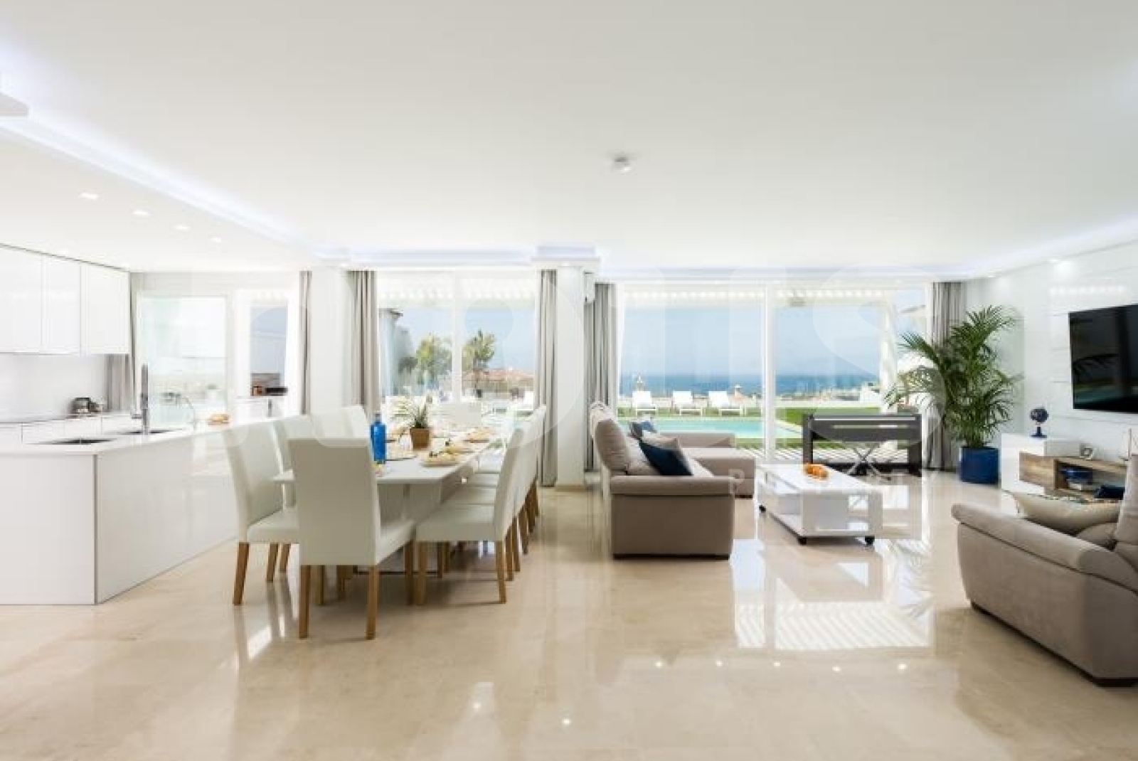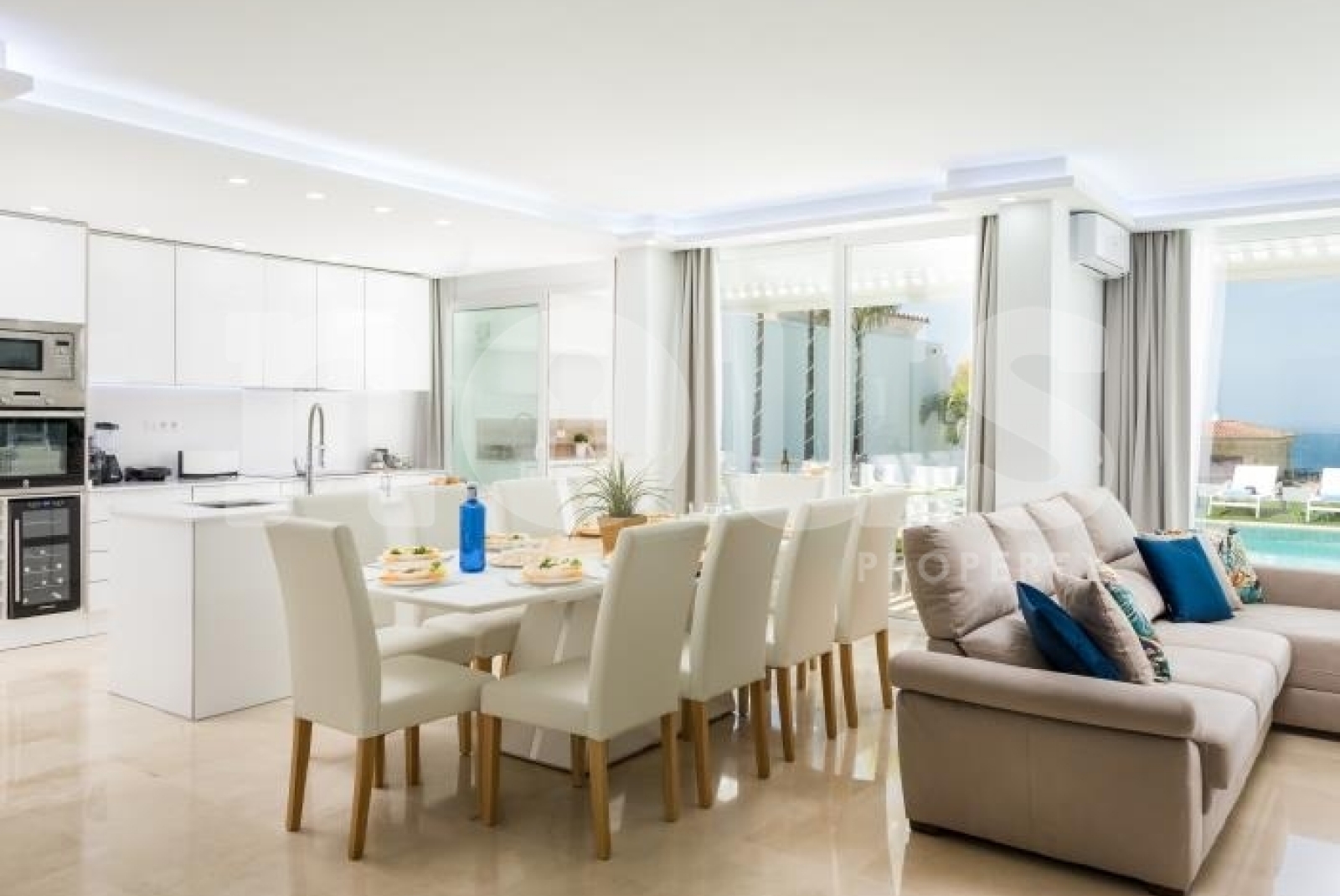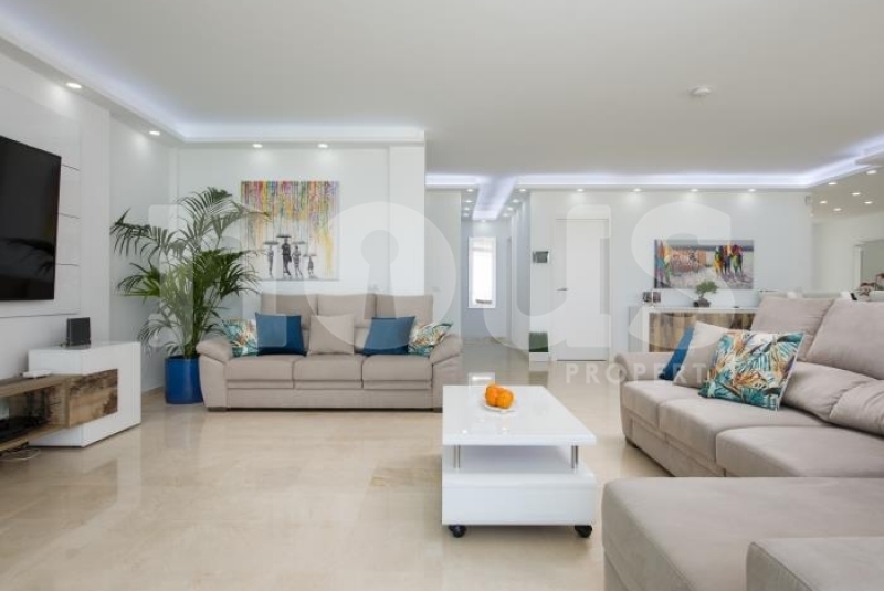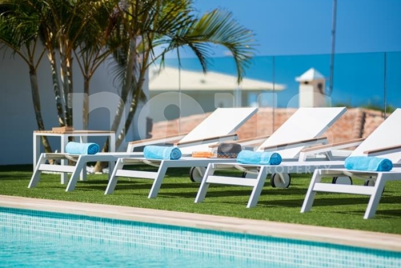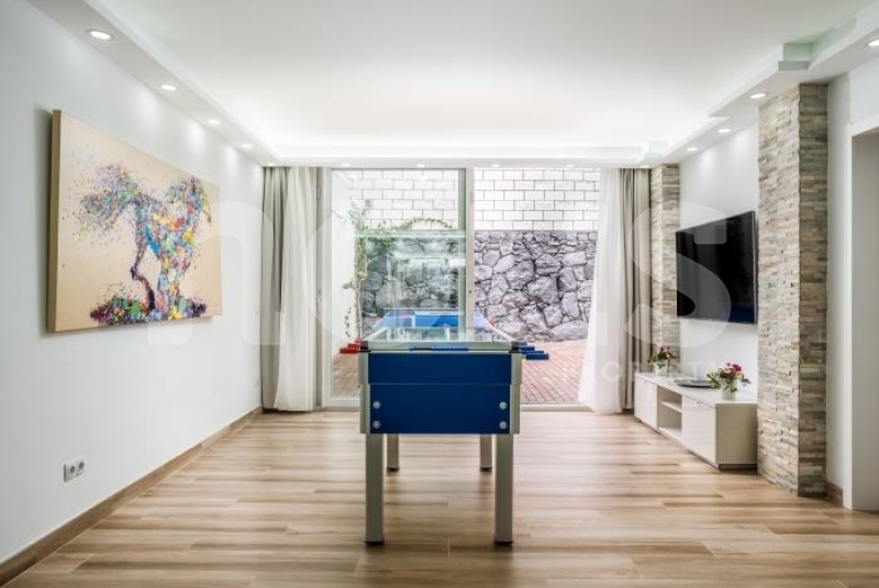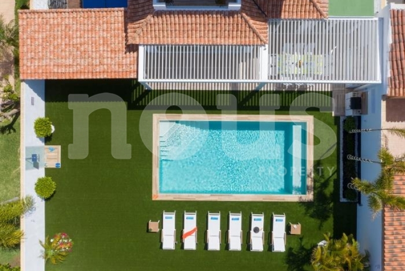 With a three-level layout, the villa offers 6 bedrooms, each with its own private bathroom and satellite televisions. With capacity for up to 10 people, the property is accessed via an elegant staircase. On the ground floor, a spacious living room with a 65-inch TV, Netflix and PlayStation4 is combined with a fully equipped kitchen, including a dishwasher, microwave, coffee maker, blender and oven. The kitchen features a water filter, providing high-quality drinking water directly from the tap, promoting environmental sustainability.