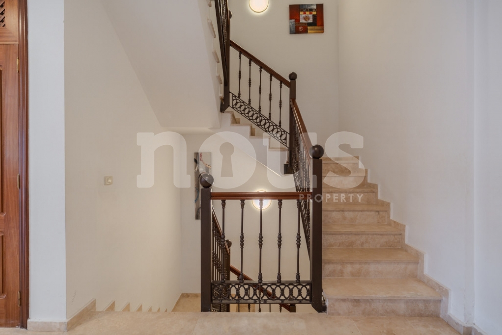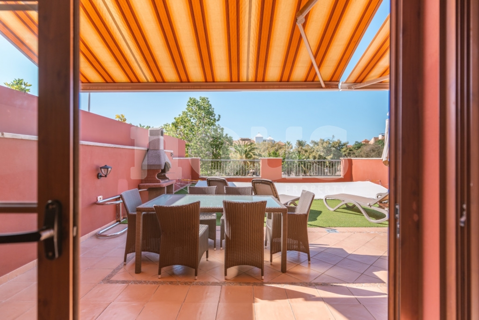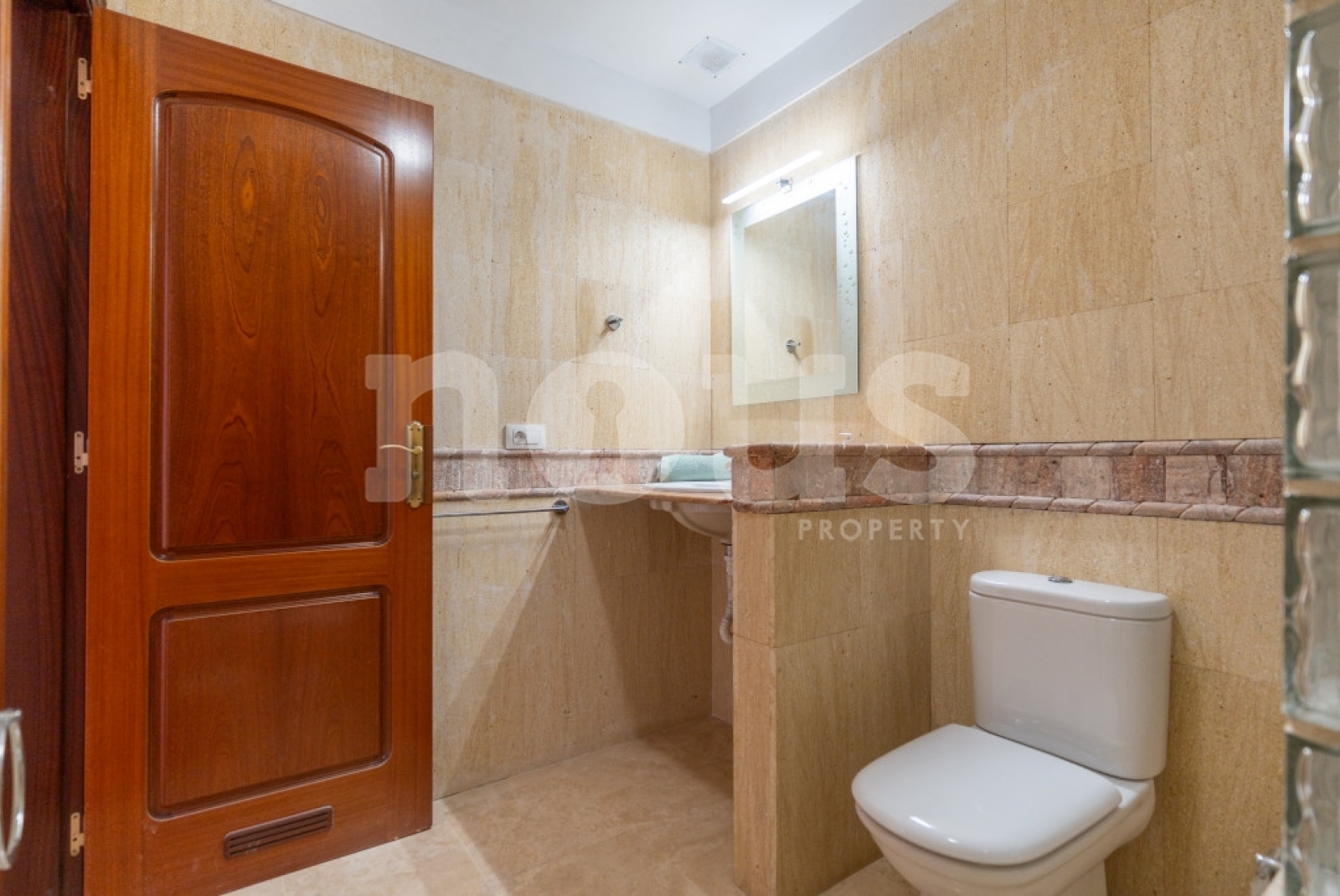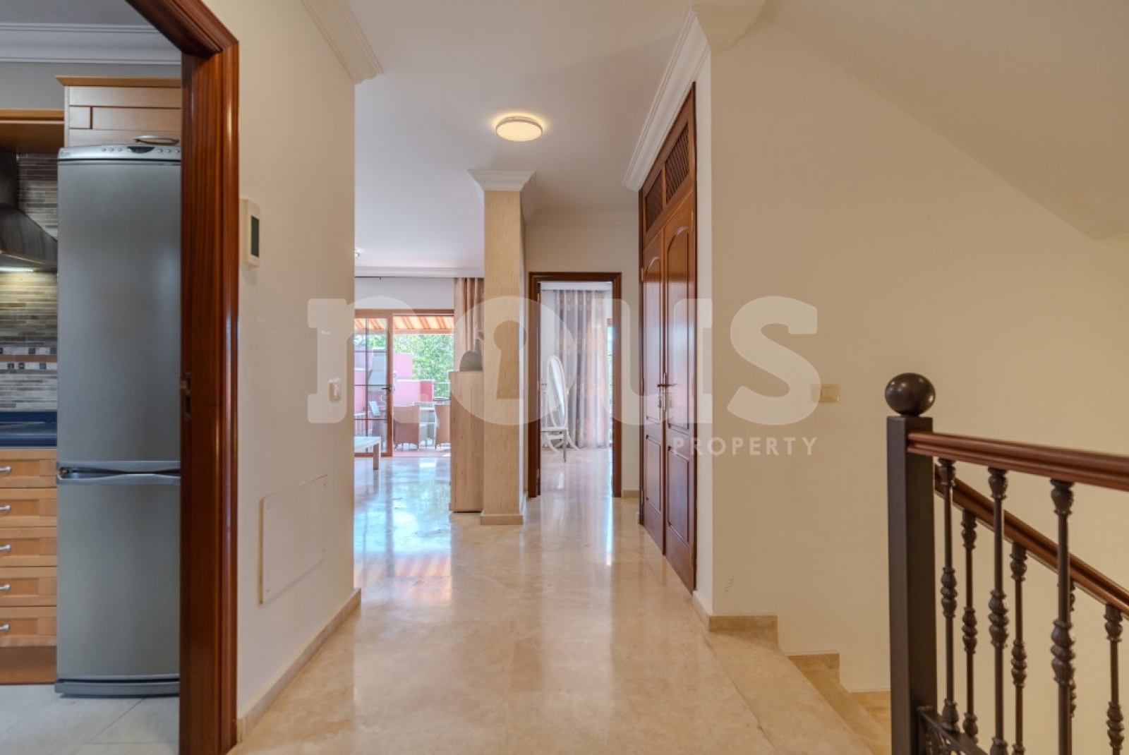 confort y serenidad en un entorno privilegiado. Tiene una superficie total construida de 303m2. La playa del Duque, centro comerciales, tiendas de lujo, bares, restaurantes y todos los servicios esenciales están a unos 10 minutos caminando. A pesar de su cercanía a todas las comodidades, es una zona residencial tranquila con espacios verdes bien cuidados y con dos piscinas, una de ellas climatizada. La casa consta de tres plantas. En el sótano de 77m2 hay un garaje privado para dos o tres coches, un trastero y más espacio para almacenamiento bajo de las escaleras. Desde el sótano se acede directamente a la planta baja de la vivienda. En esta planta se encuentran un recibidor con armarios empotrados, una cocina independiente y equipada, con un cuarto de lavado adyacente, un salón-comedor, un baño con ducha y un dormitorio con armarios empotrados. Desde el salón y el dormitorio se acede a la grande y soleada terraza, donde se encuentra la piscina privada y una zona de barbacoa, con vista a un parque. En la primera planta hay otros dos dormitorios ambos con armarios empotrados, dos baños, uno de ellos en suite, y en el pasillo mas armarios empotrados. El dormitorio principal tiene salida a una terraza con vista al parque y un poco al mar. El otro dormitorio tiene un pequeño balcón y también vista al parque. La planta baja y alta tienen un total de 135m2. Comunidad: 265€/ mes Hay una derrama de 200€ mensuales hasta abril 2026 para acometer mejoras en las zonas comunes. IBI: 925€/ año