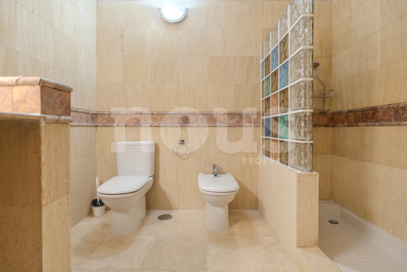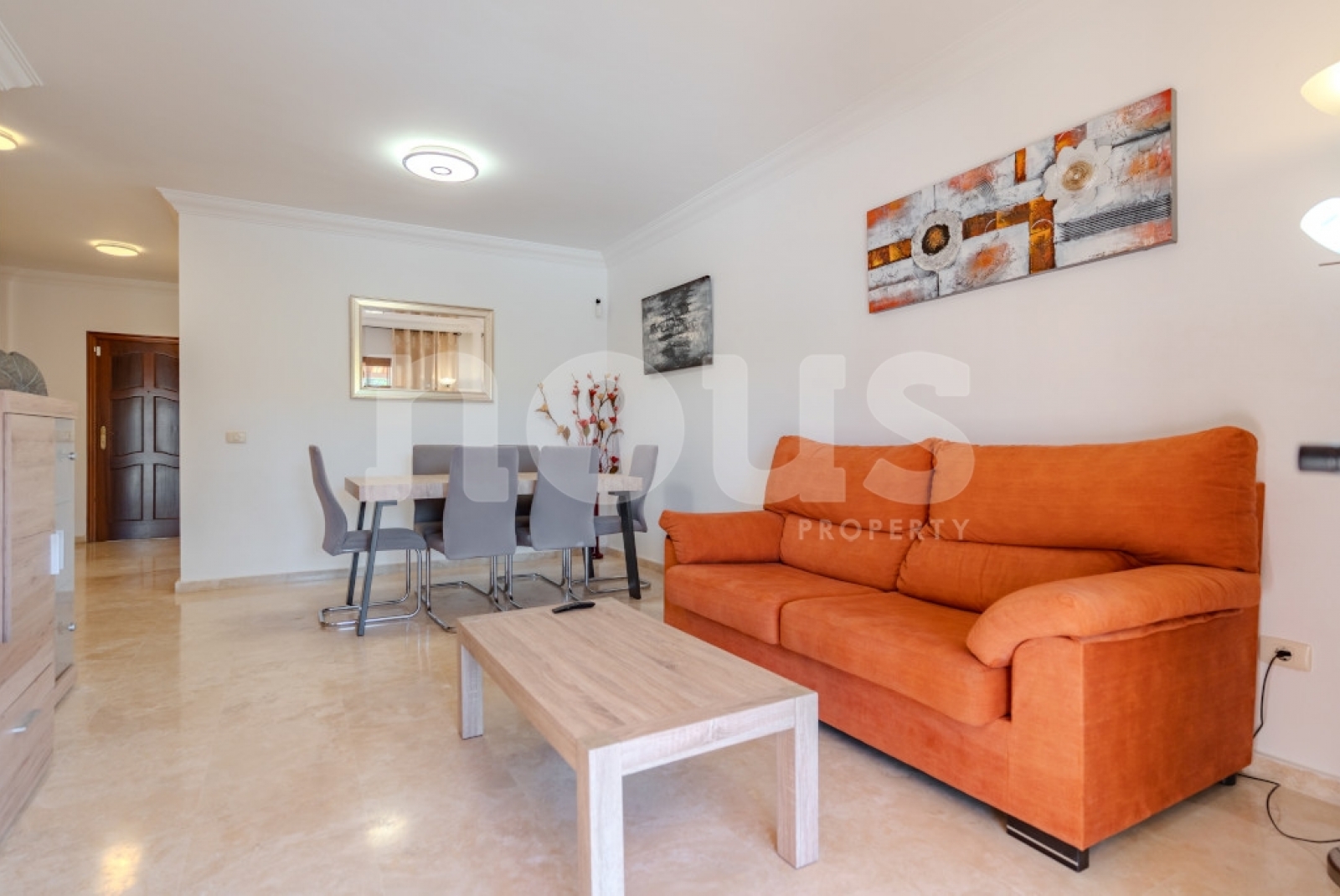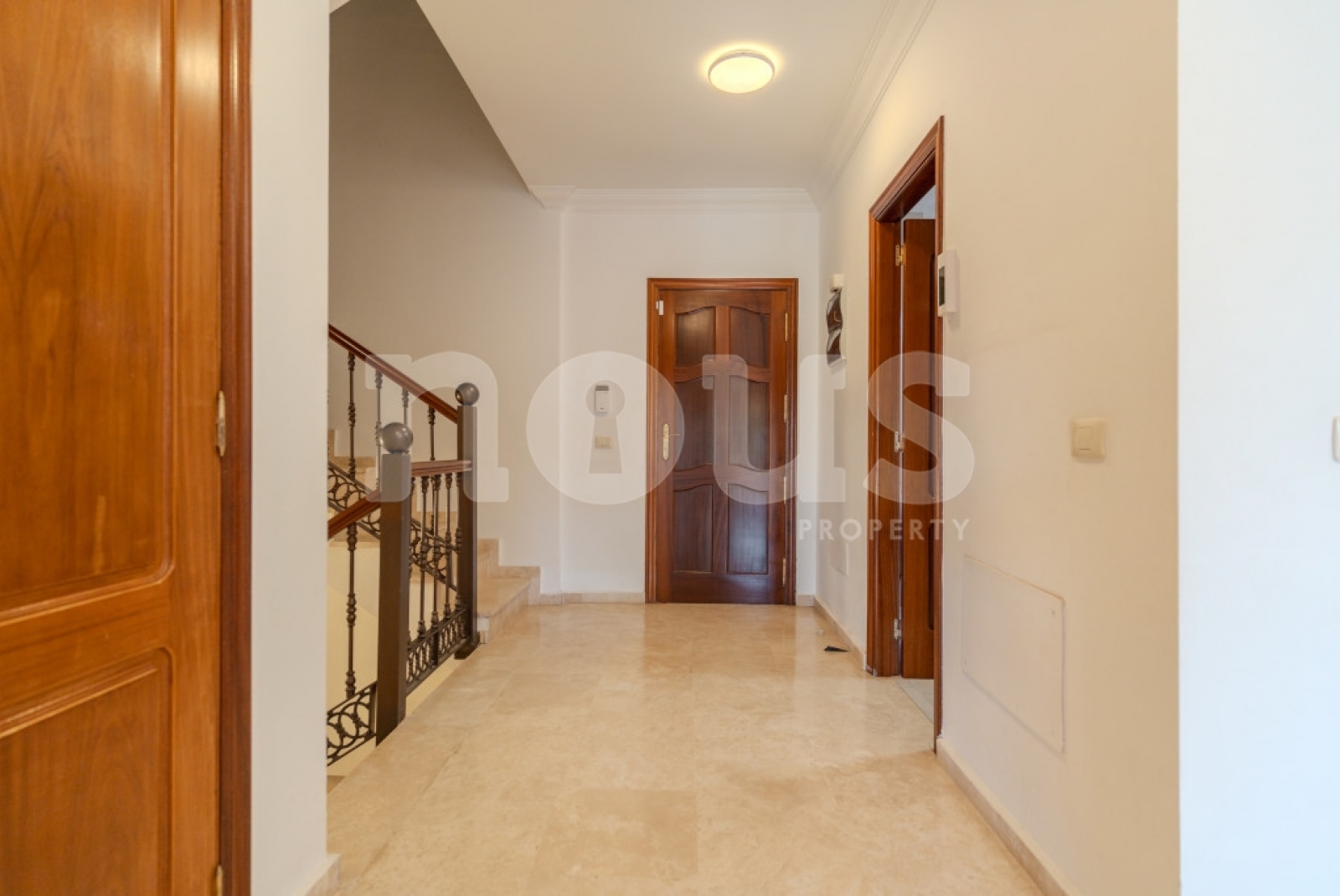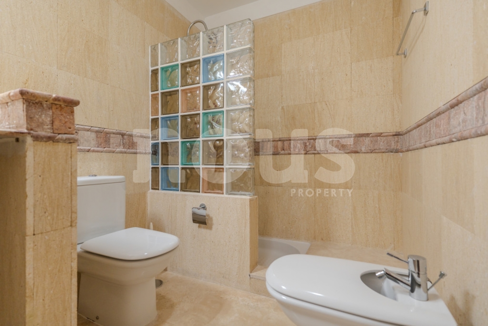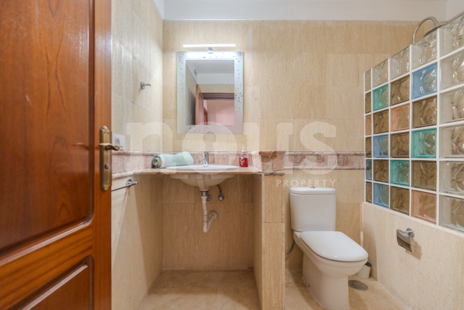 confort y serenidad en un entorno privilegiado. Tiene una superficie total construida de 303m2. La playa del Duque, centro comerciales, tiendas de lujo, bares, restaurantes y todos los servicios esenciales están a unos 10 minutos caminando. A pesar de su cercanía a todas las comodidades, es una zona residencial tranquila con espacios verdes bien cuidados y con dos piscinas, una de ellas climatizada. La casa consta de tres plantas. En el sótano de 77m2 hay un garaje privado para dos o tres coches, un trastero y más espacio para almacenamiento bajo de las escaleras. Desde el sótano se acede directamente a la planta baja de la vivienda. En esta planta se encuentran un recibidor con armarios empotrados, una cocina independiente y equipada, con un cuarto de lavado adyacente, un salón-comedor, un baño con ducha y un dormitorio con armarios empotrados. Desde el salón y el dormitorio se acede a la grande y soleada terraza, donde se encuentra la piscina privada y una zona de barbacoa, con vista a un parque. En la primera planta hay otros dos dormitorios ambos con armarios empotrados, dos baños, uno de ellos en suite, y en el pasillo mas armarios empotrados. El dormitorio principal tiene salida a una terraza con vista al parque y un poco al mar. El otro dormitorio tiene un pequeño balcón y también vista al parque. La planta baja y alta tienen un total de 135m2. Comunidad: 265€/ mes Hay una derrama de 200€ mensuales hasta abril 2026 para acometer mejoras en las zonas comunes. IBI: 925€/ año