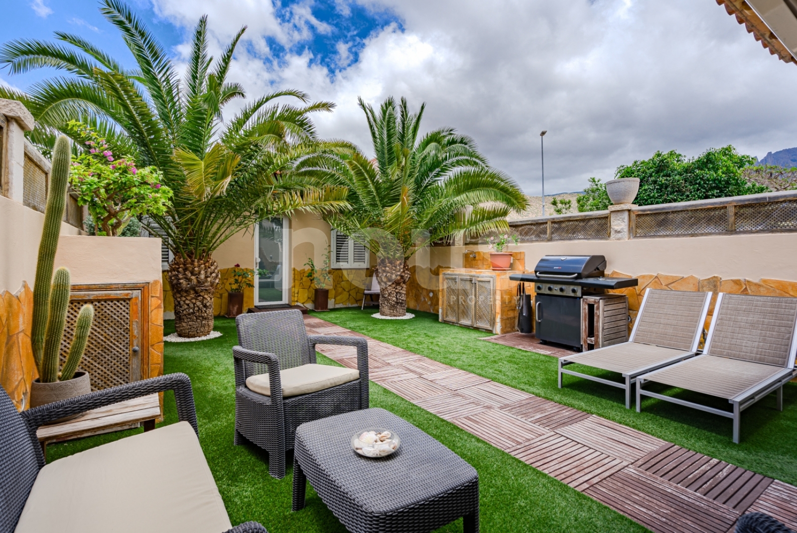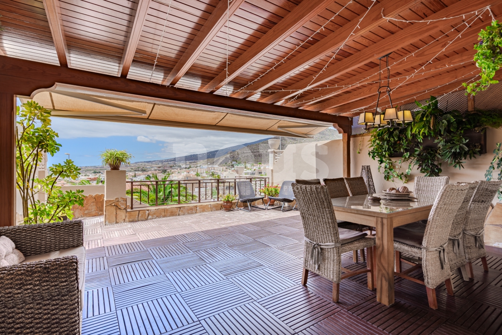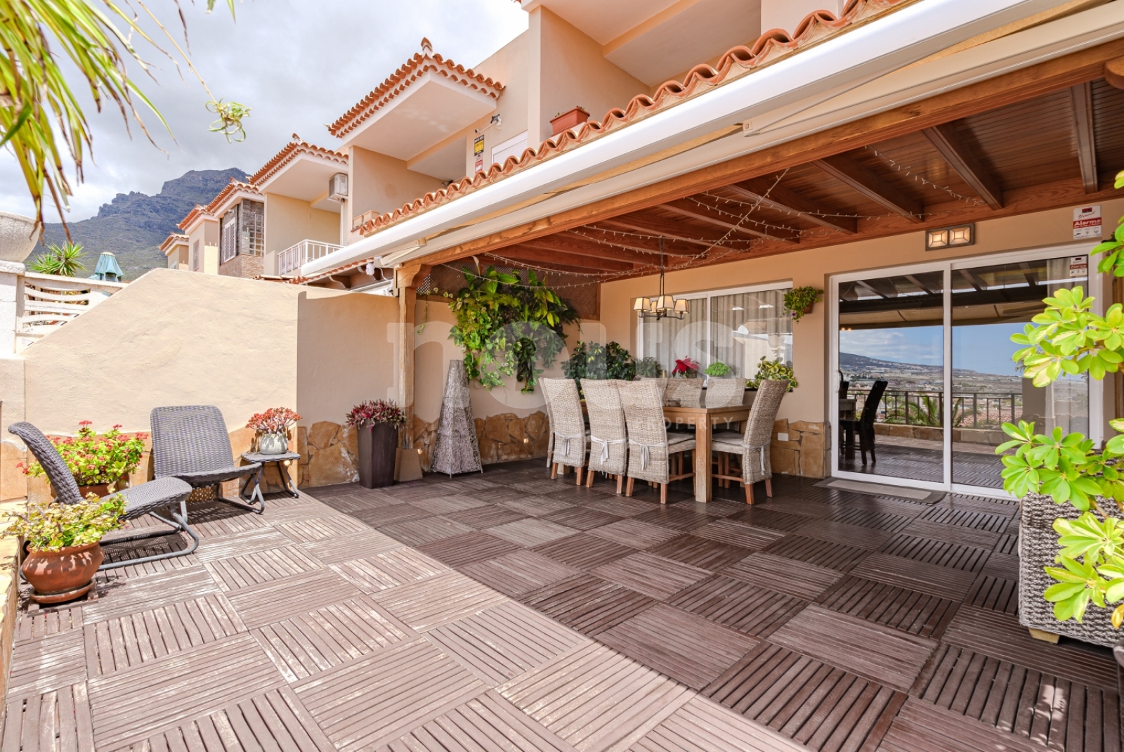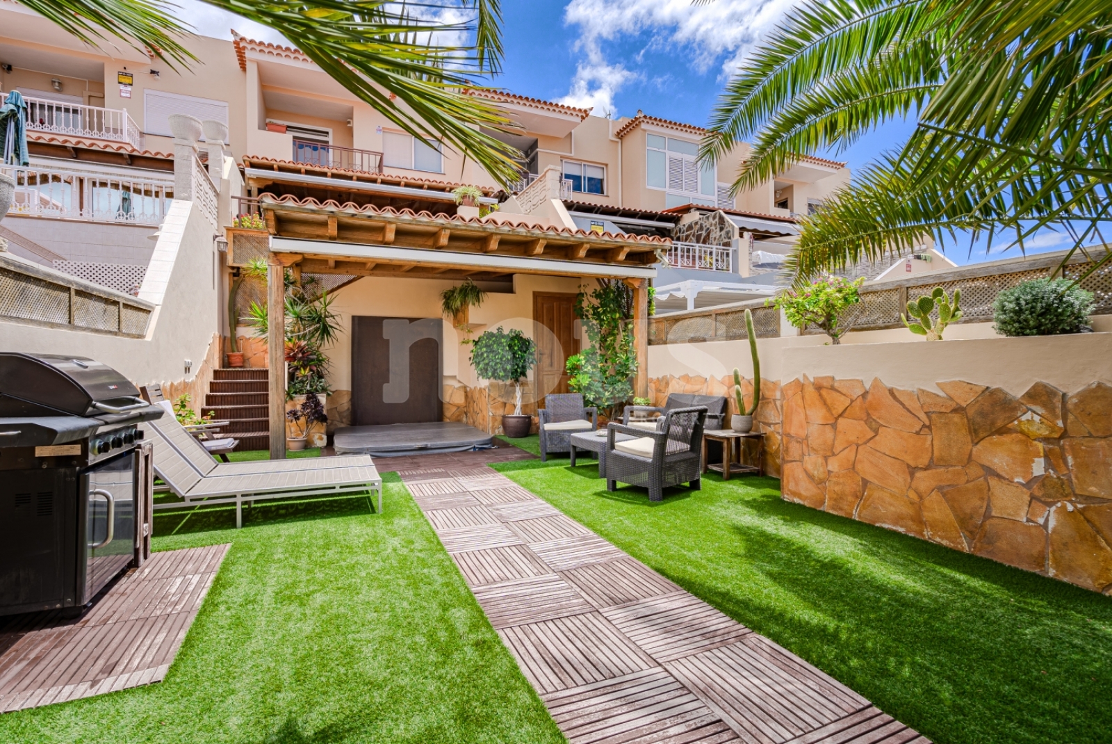 Magnífico Adosado en Venta en Residencial Roque del Conde, Torviscas Alto – 3 Dormitorios con Vistas al Mar. Te presentamos esta exclusiva propiedad en venta en el prestigioso Residencial Roque del Conde, en Torviscas Alto, una de las zonas más deseadas del sur de Tenerife. Este adosado de 3 plantas cuenta con todo lo necesario para vivir con lujo y comodidad, siendo también una excelente oportunidad de inversión. Con 3 amplios dormitorios y 3 baños completos, esta propiedad ofrece el espacio perfecto para familias o aquellos que buscan una casa de vacaciones en una ubicación privilegiada. La cocina independiente está completamente equipada, ideal para quienes disfrutan de la gastronomía y desean disponer de un espacio amplio y funcional para cocinar. Además, la propiedad cuenta con 2 amplias terrazas, perfectas para disfrutar del clima soleado de Tenerife. Una de las terrazas incluye una zona de barbacoa y un jacuzzi privado, lo que convierte a este espacio en el lugar perfecto para relajarse o para entretener a invitados mientras disfrutas de unas espectaculares vistas al mar. El adosado dispone de un garaje cerrado con capacidad para 2 coches, brindando comodidad y seguridad adicional. Las vistas panorámicas desde las terrazas y los balcones del adosado hacia el océano Atlántico son impresionantes, lo que añade un toque extra de exclusividad y tranquilidad a esta propiedad. El Residencial Roque del Conde es conocido por su excelente ubicación, a solo unos minutos en coche de las principales playas de Costa Adeje, centros comerciales como Siam Mall y Gran Sur, y servicios como restaurantes, colegios internacionales, y hospitales. Esta propiedad es ideal tanto para aquellos que buscan una residencia permanente como para quienes buscan una casa de vacaciones o una inversión en el sur de Tenerife.