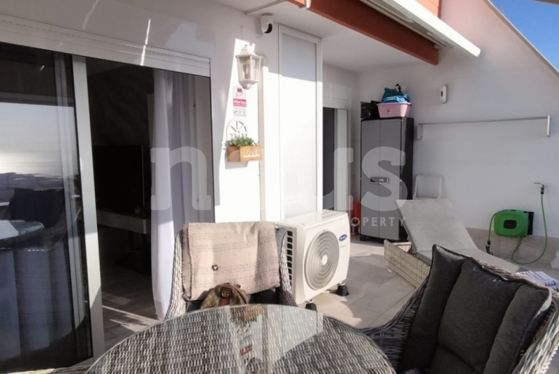 La vivienda dispone de un salón-comedor espacioso con cocina abierta y acceso directo a una terraza de 21 m² con vistas panorámicas al océano y la montaña. Cuenta con 2 dormitorios equipados con armarios empotrados y un baño completo.