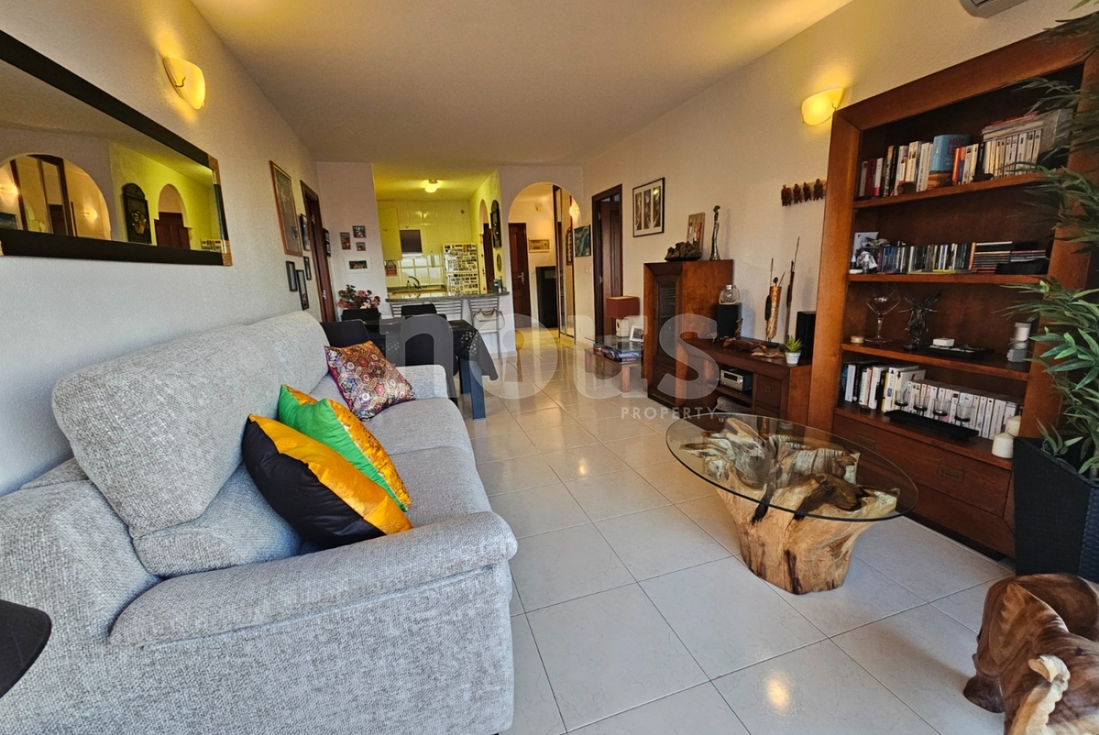 La zona de día cuenta con un diseño contemporáneo. La cocina, totalmente equipada y con barra americana, se integra de forma fluida en el salón, creando un espacio abierto, luminoso y bien conectado.