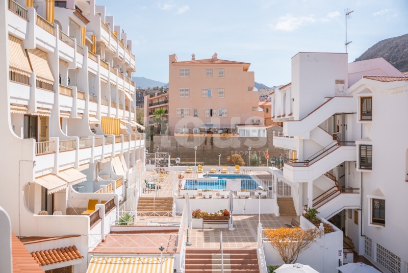 Amplio piso de 2 dormitorios en venta, situado justo detrás de la estación de buses de Los Cristianos. Se encuentra en la planta baja de un edificio residencial con cuidadas zonas ajardinadas, con 2 piscinas y bar con terraza propia. A pocos metros del océano y a sólo 400 metros del paseo marítimo, esta propiedad goza de una ubicación privilegiada cerca del centro comercial La Pepa y cerca de tiendas, supermercados, bancos y restaurantes. El complejo está ubicado en una zona residencial tranquila. Dispone de un baño completo reformado con ducha. La cocina está totalmente equipada y de estilo moderno. El salón es amplio y dispone de zona de comedor y sofá con TV. La terraza grande tiene vista a la calle con espacio para tomar el sol. El piso es muy luminoso y tiene una buena distribución. Se vende amueblado. Los gastos de comunidad ascienden a 100 al mes. Con 78 m' construidos y 61 m' útiles, es ideal para disfrutar de una vida cómoda y relajada.