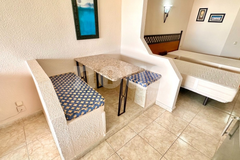 Te ofrecemos una oportunidad única de tener tu propio estudio en planta baja en el codiciado complejo de apartamentos/hotel Santa María. Este estudio ofrece un espacio habitable cómodo y accesible. Al entrar, te recibirán un baño completo con ducha y bañera. La zona de descanso cuenta con dos cómodas camas individuales y un amplio armario, asegurando espacio suficiente para tus pertenencias. El estudio en venta está ubicado en Santa María (Torviscas). El diseño permite una transición perfecta entre el área de descanso y la sala de estar/cocina, creando un ambiente abierto y acogedor. Uno de los aspectos destacados de este estudio es la sala de estar, que se abre a un balcón con vistas parciales al océano. Este espacio ofrece un ambiente tranquilo y relajante para disfrutar del aire fresco y tomar el sol. El costo de la comunidad es de €227 e incluye los servicios de agua y electricidad. La proximidad a la recepción y la piscina aumenta la comodidad y la experiencia de vivir en este estudio. El complejo cuenta con dos piscinas, todas climatizadas durante el invierno, una recepción abierta las 24 horas, un bar junto a la piscina y una terraza en la azotea. Situado en el corazón de Torviscas, este apartamento/hotel ofrece un acceso conveniente a una variedad de servicios, incluyendo tiendas, bares y restaurantes. Santa María se encuentra en Costa Adeje, a solo 300 metros de la playa y a 10 minutos a pie de Puerto Colón. Santa María está a menos de cinco minutos en coche de Siam Park y de la playa de Fañabé. Además, está a pocos metros del Club Náutico Puerto Colón y a 1.8 km de Aqualand Costa Adeje. No pierdas esta excelente oportunidad de adquirir un estudio en planta baja en el atractivo complejo de Santa María. ¡Contáctanos ahora para organizar una visita y asegurarte esta increíble propiedad!