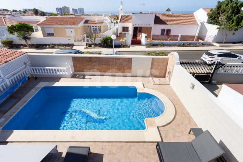 Bungalow totalmente reformado con piscina situado en una tranquila zona residencial en Callao Salvaje. La propiedad ofrece 3 dormitorios y 3 baños, amplio salón y una cocina totalmente equipada. Una escalera exterior lleva a la bonita terraza de la azotea. Hay un garaje de 30m2.