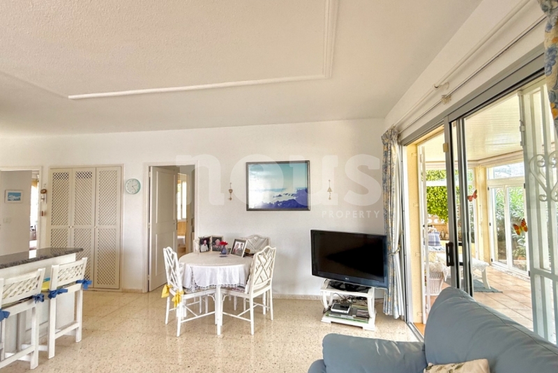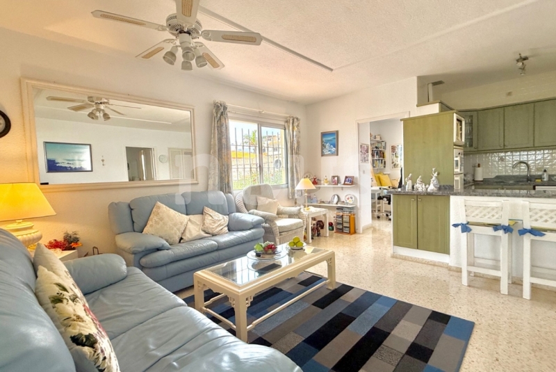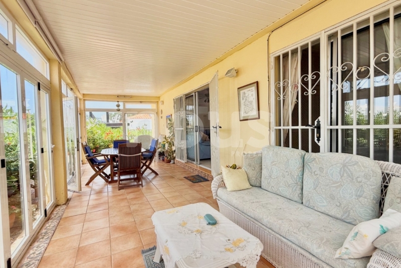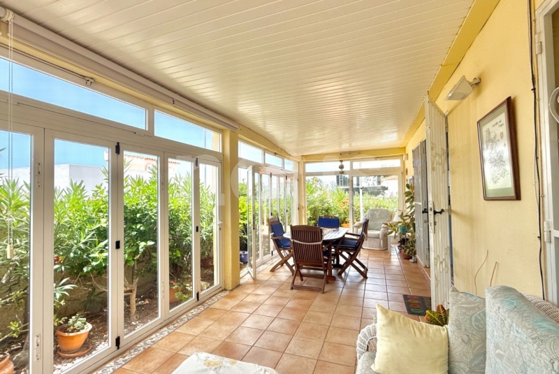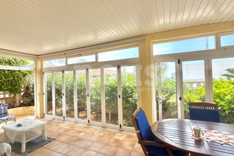 El bungalow cuenta con una superficie habitable de 110 m² y se asienta sobre una parcela de 225 m², rodeada por una amplia terraza y una zona ajardinada que envuelve la vivienda por completo, ofreciendo un entorno tranquilo y privado. Distribuido en una sola planta, dispone de tres dormitorios, dos baños, un amplio salón-comedor, cocina americana totalmente equipada y una acogedora terraza de invierno acristalada.