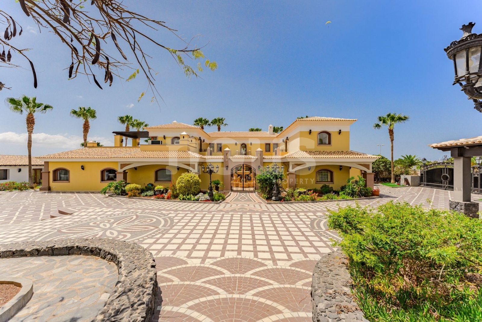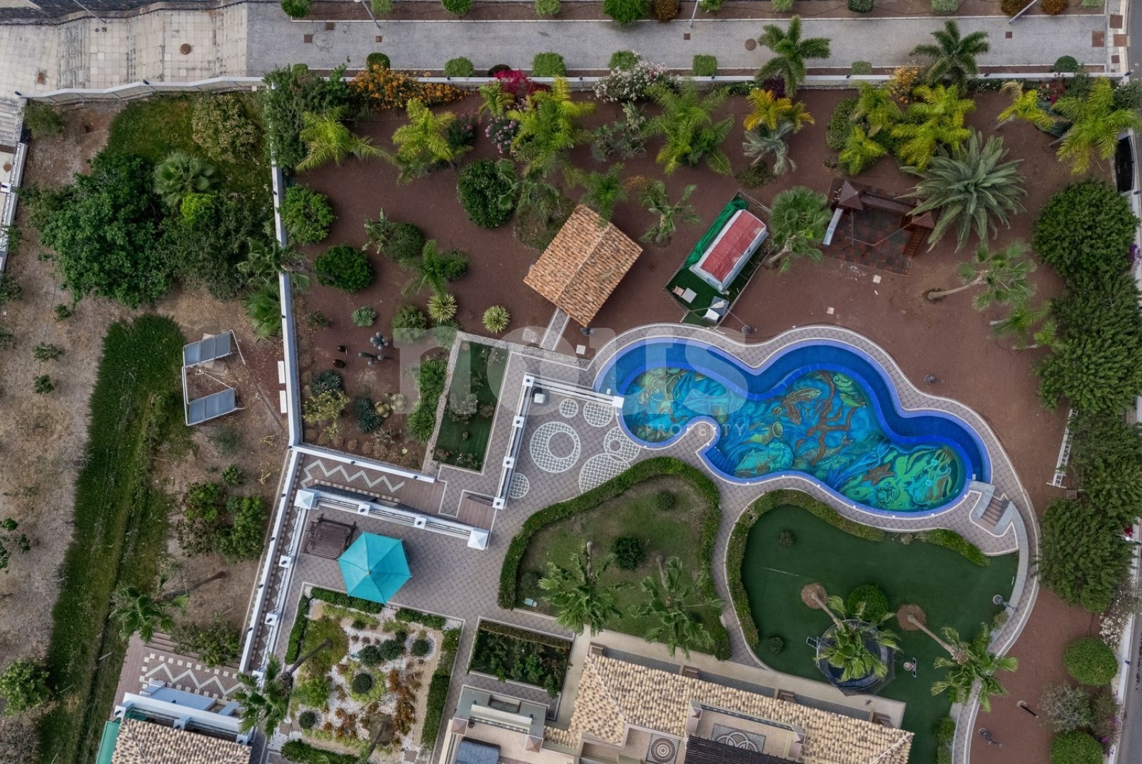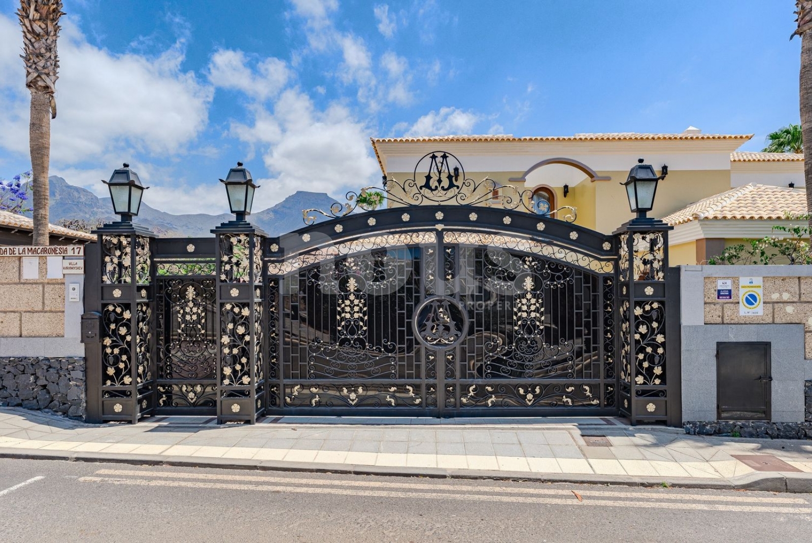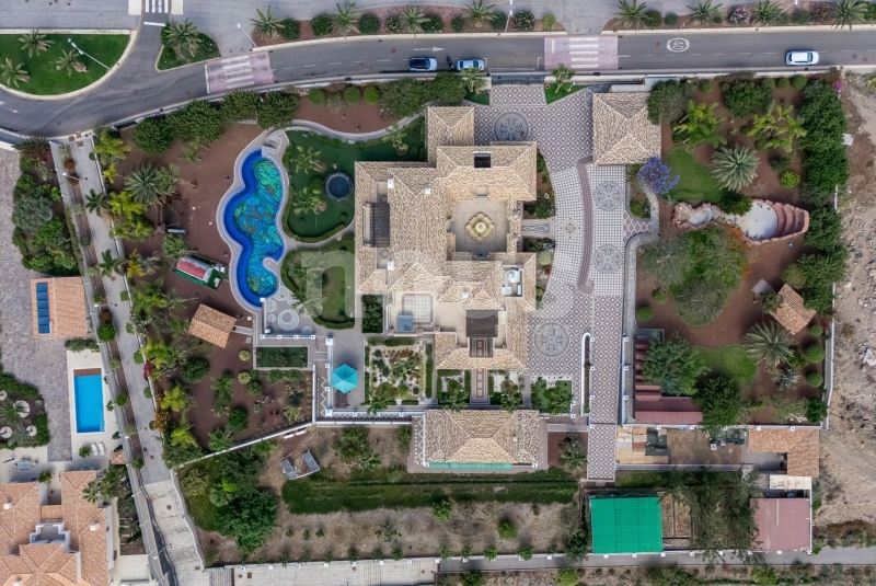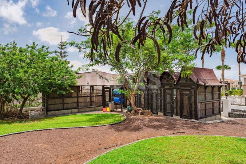 El exterior ofrece una piscina climatizada de 25 metros con mosaicos, jardines con una variedad de palmeras, huerto de frutas, sistema de riego automático, depósitos de agua de gran capacidad, sistema de energía de 50 kW, videovigilancia y alarma.