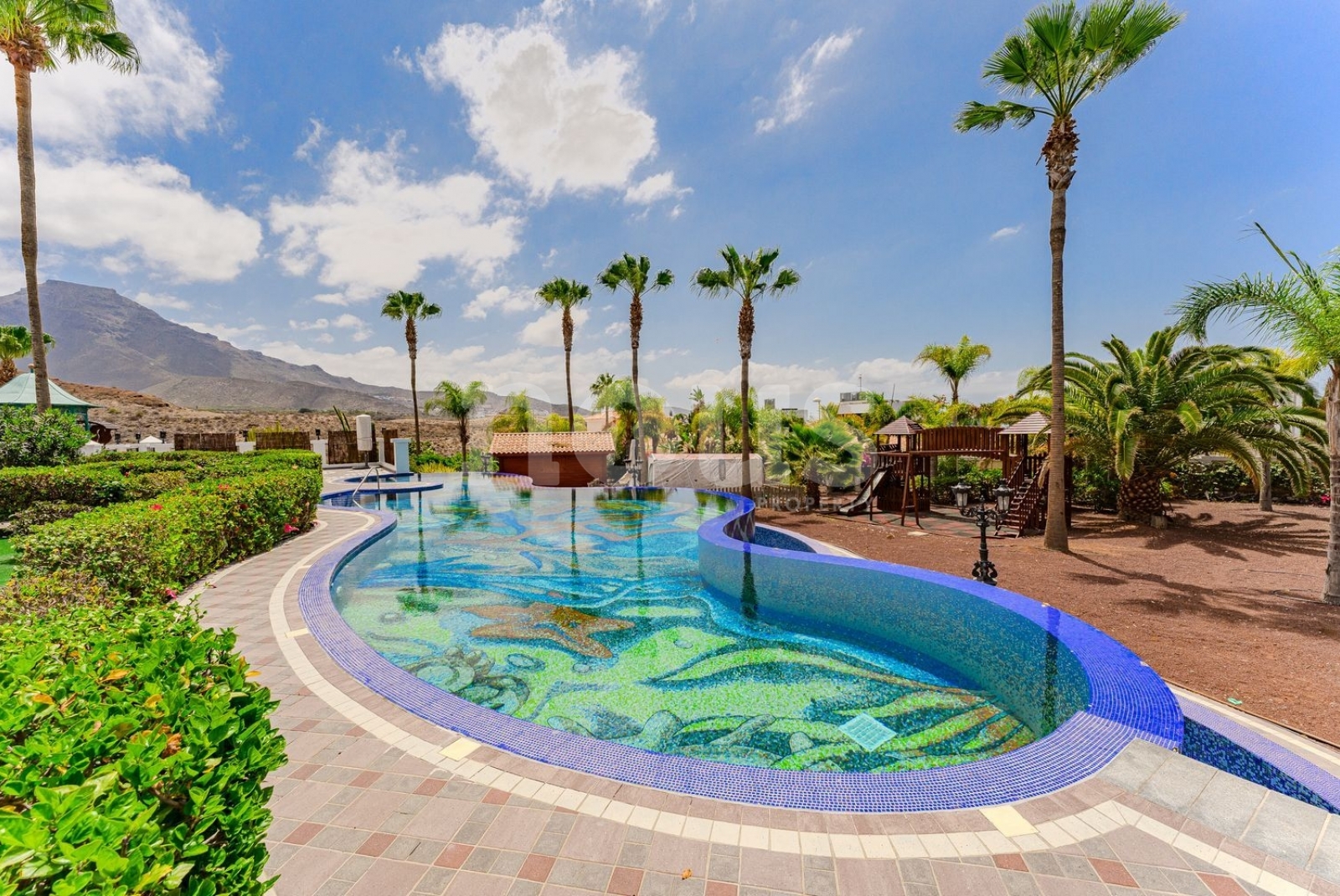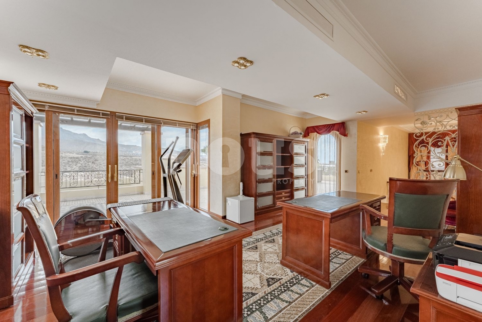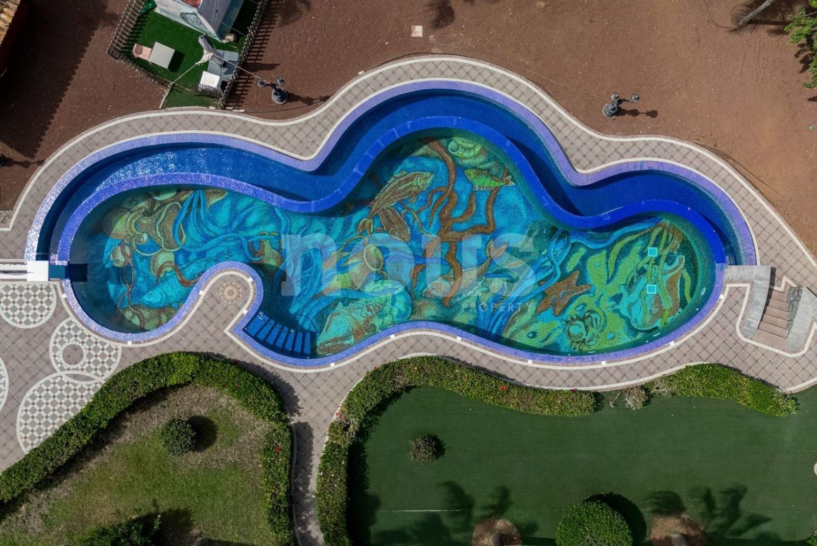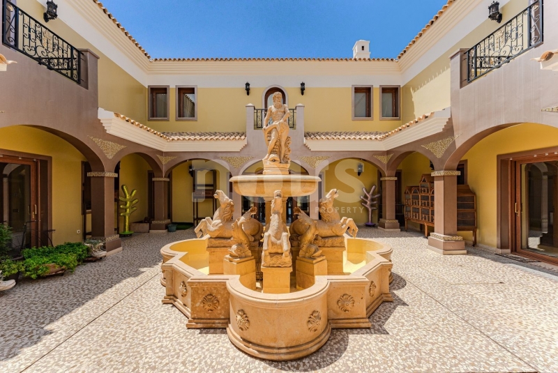 El exterior ofrece una piscina climatizada de 25 metros con mosaicos, jardines con una variedad de palmeras, huerto de frutas, sistema de riego automático, depósitos de agua de gran capacidad, sistema de energía de 50 kW, videovigilancia y alarma.