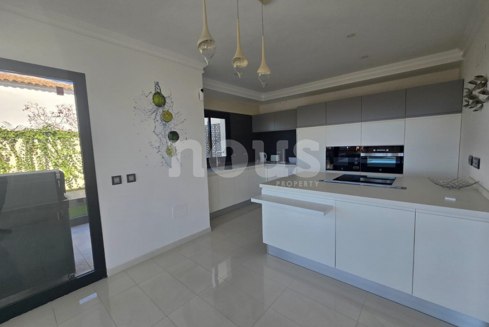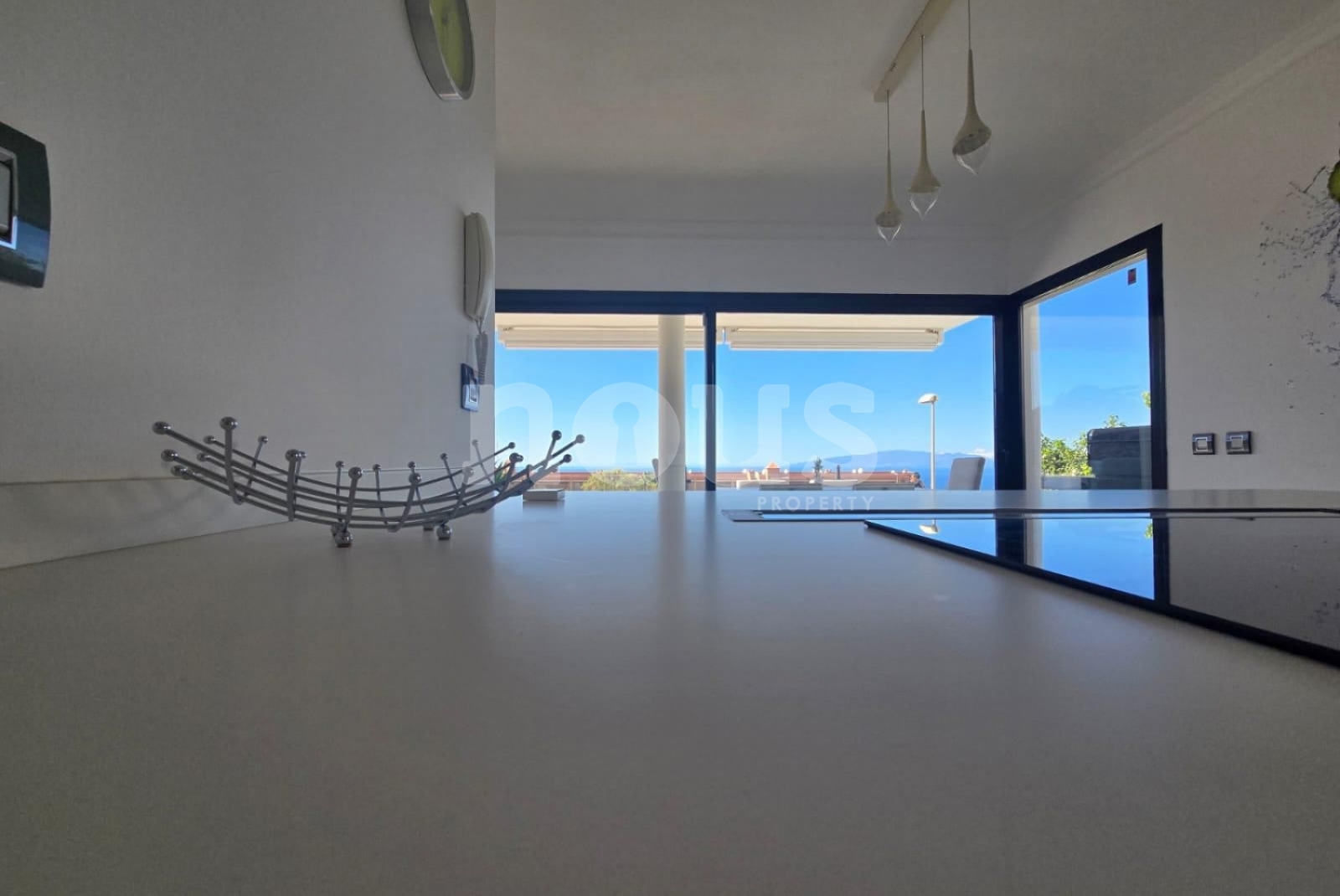 La primera planta cuenta con un salón amplio y luminoso con cocina americana de concepto abierto. Desde esta zona se disfruta de vistas al mar y acceso directo a la gran terraza exterior y a la piscina privada. El diseño abierto conecta el interior con el exterior de forma natural, creando un espacio cómodo para el día a día, reuniones con amigos o comidas al aire libre.