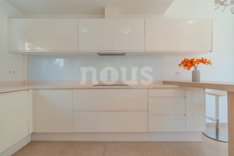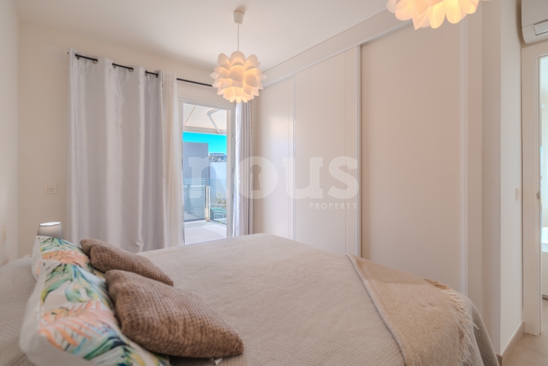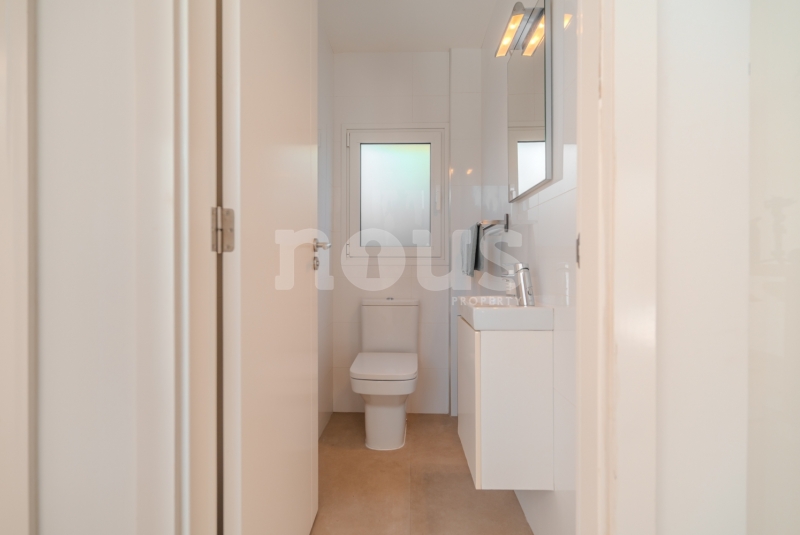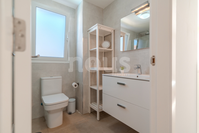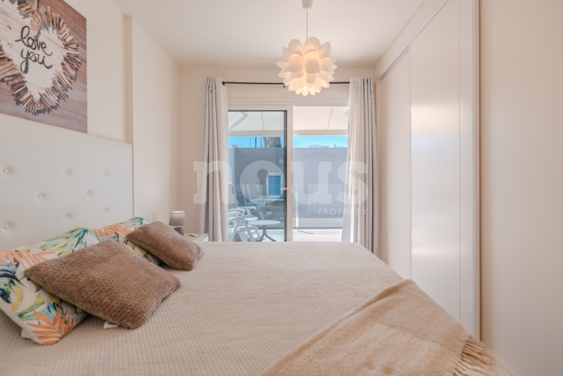 * Planta alta de 66,02 m² con tres dormitorios con armarios empotrados, dos baños (uno en suite), cuarto de almacenamiento y terraza con una pequeña vista al mar desde el dormitorio principal.