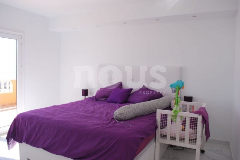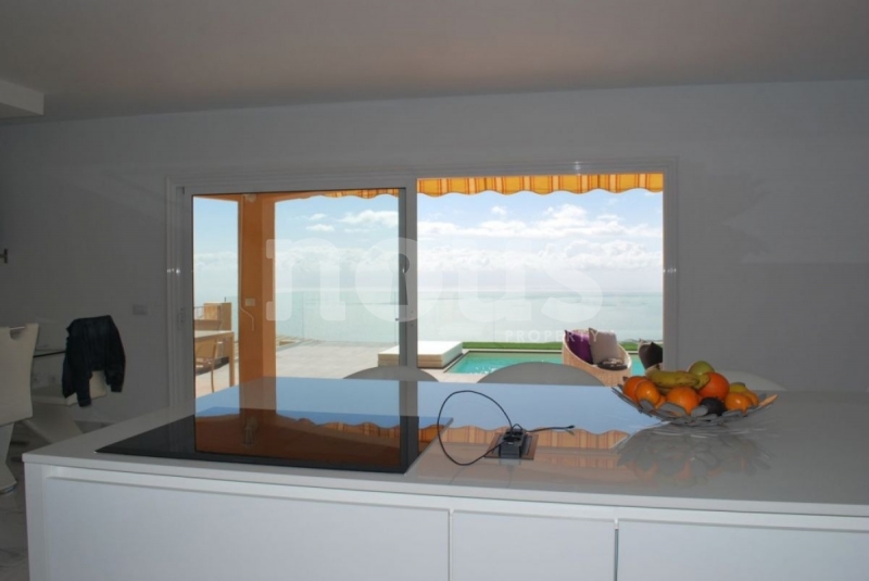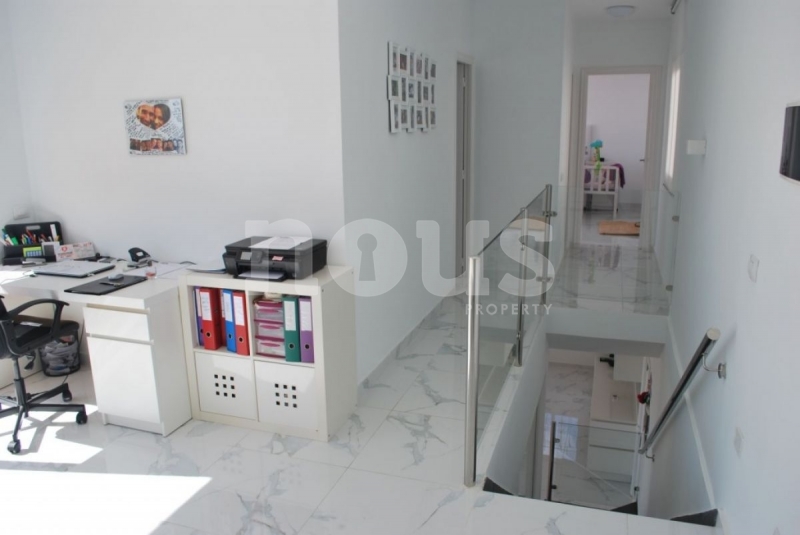La planta superior dispone de un despacho con acceso a una gran terraza con vistas a la montaña y al mar, un vestidor, un baño con ducha y un amplio dormitorio principal con acceso a la terraza y vistas al mar.