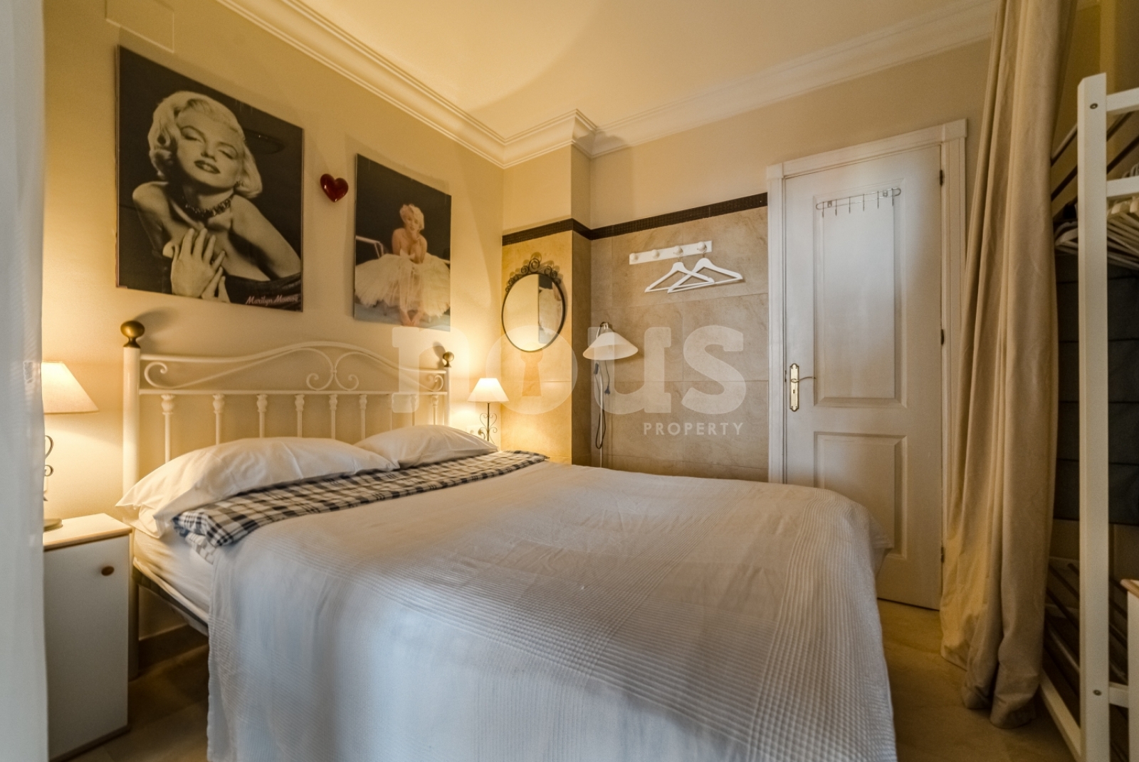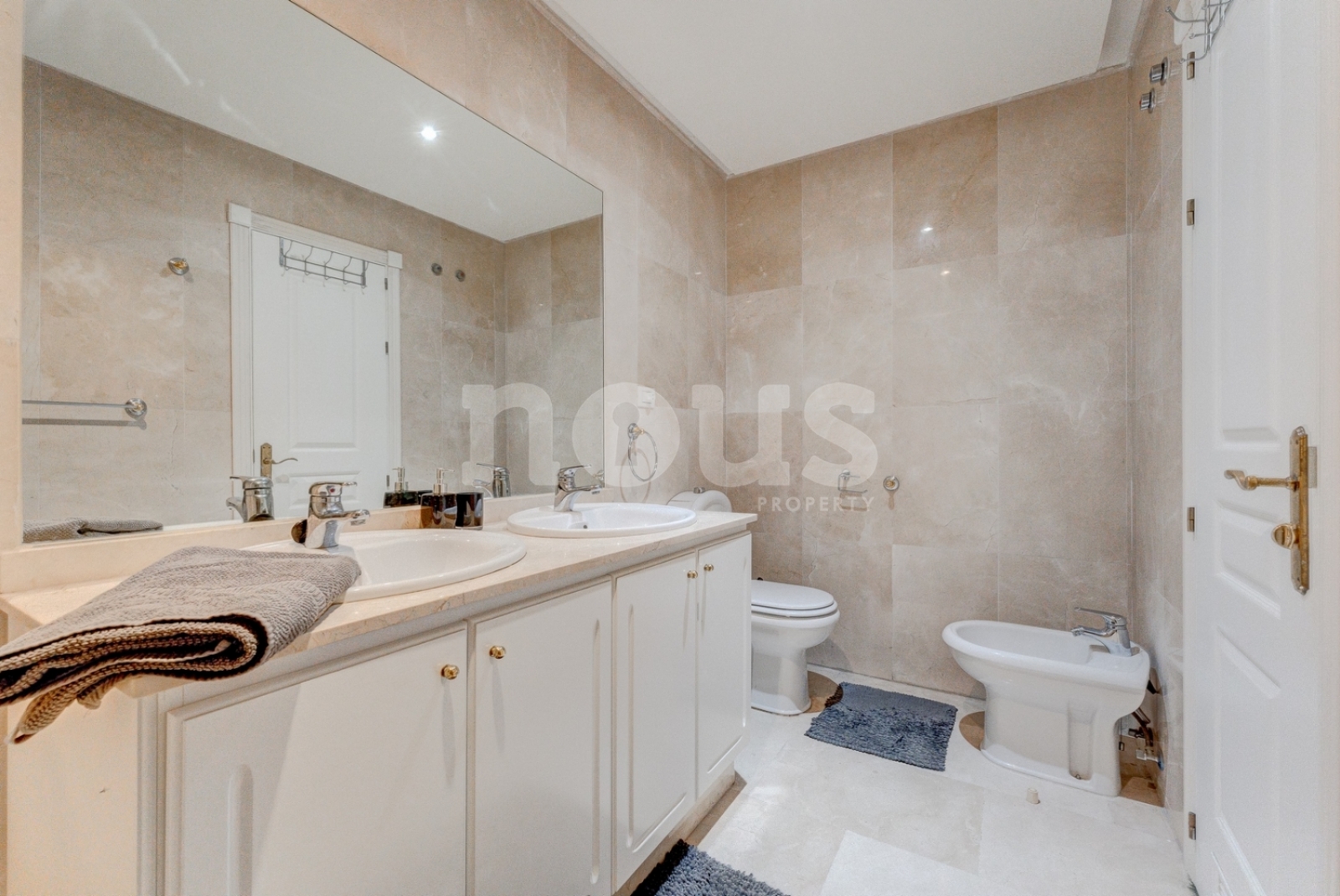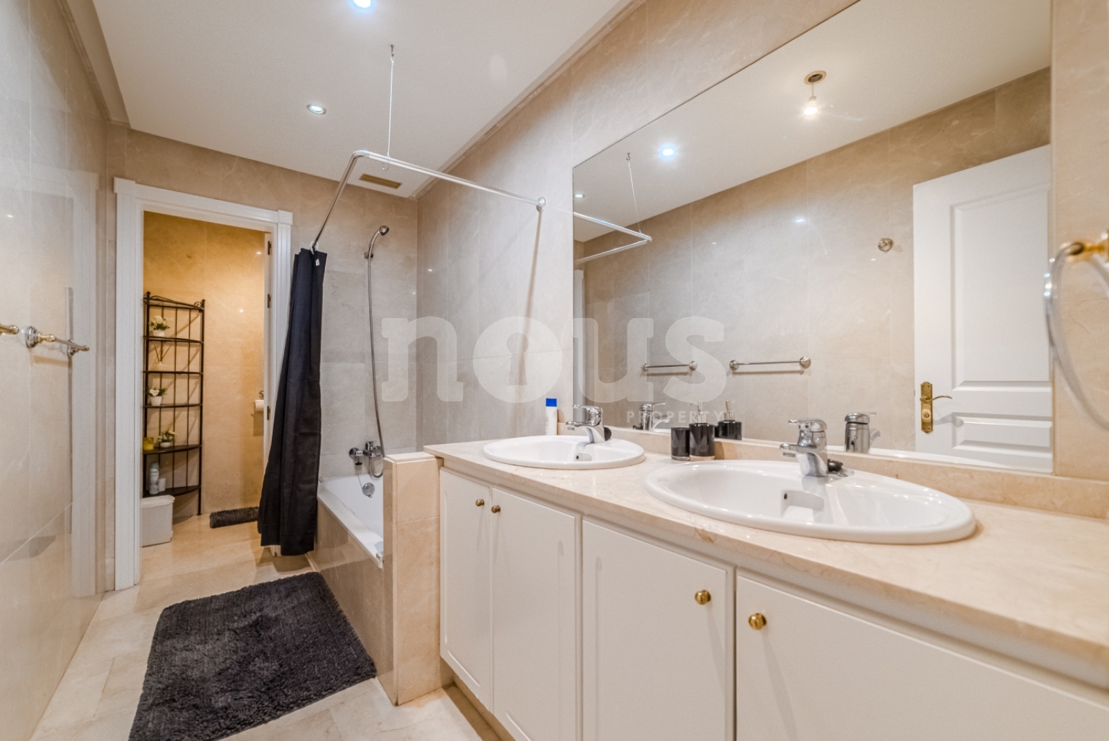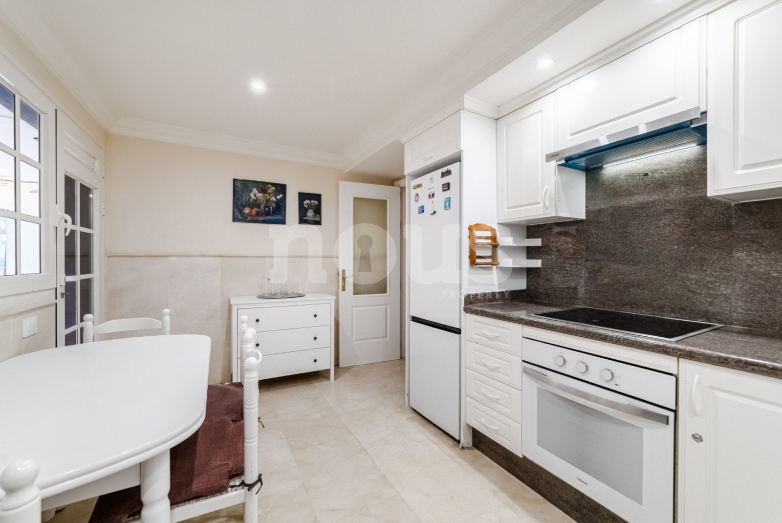Descriptif détaillé de l'appartement : cuisine séparée, équipée en électroménager : cuisinière, four, bouilloire, cafetière, micro-onde, grille-pain, lave-vaisselle, réfrigérateur. Il y a des ustensiles pour cuisiner et manger. Salon confortable avec canapé et TV. Chambre principale avec lit double et salle de bain attenante avec baignoire. Deuxième chambre avec lit double. Deuxième salle de bain avec baignoire. Toutes les pièces de l'appartement ont accès à une grande terrasse avec un coin repas, un coin salon, des chaises longues.