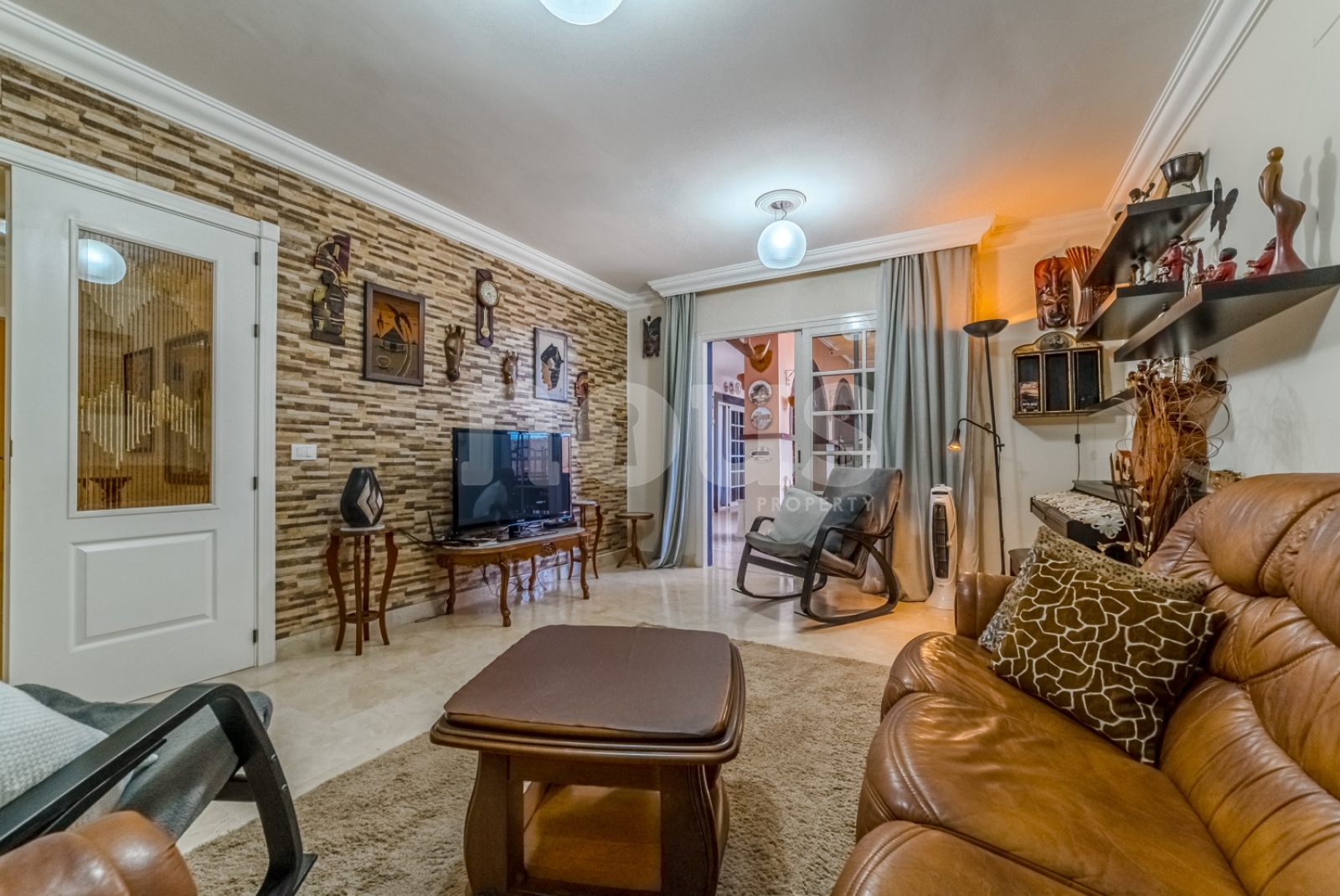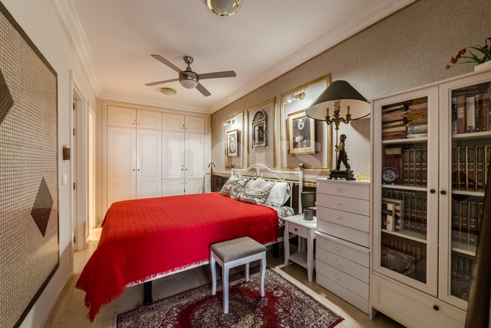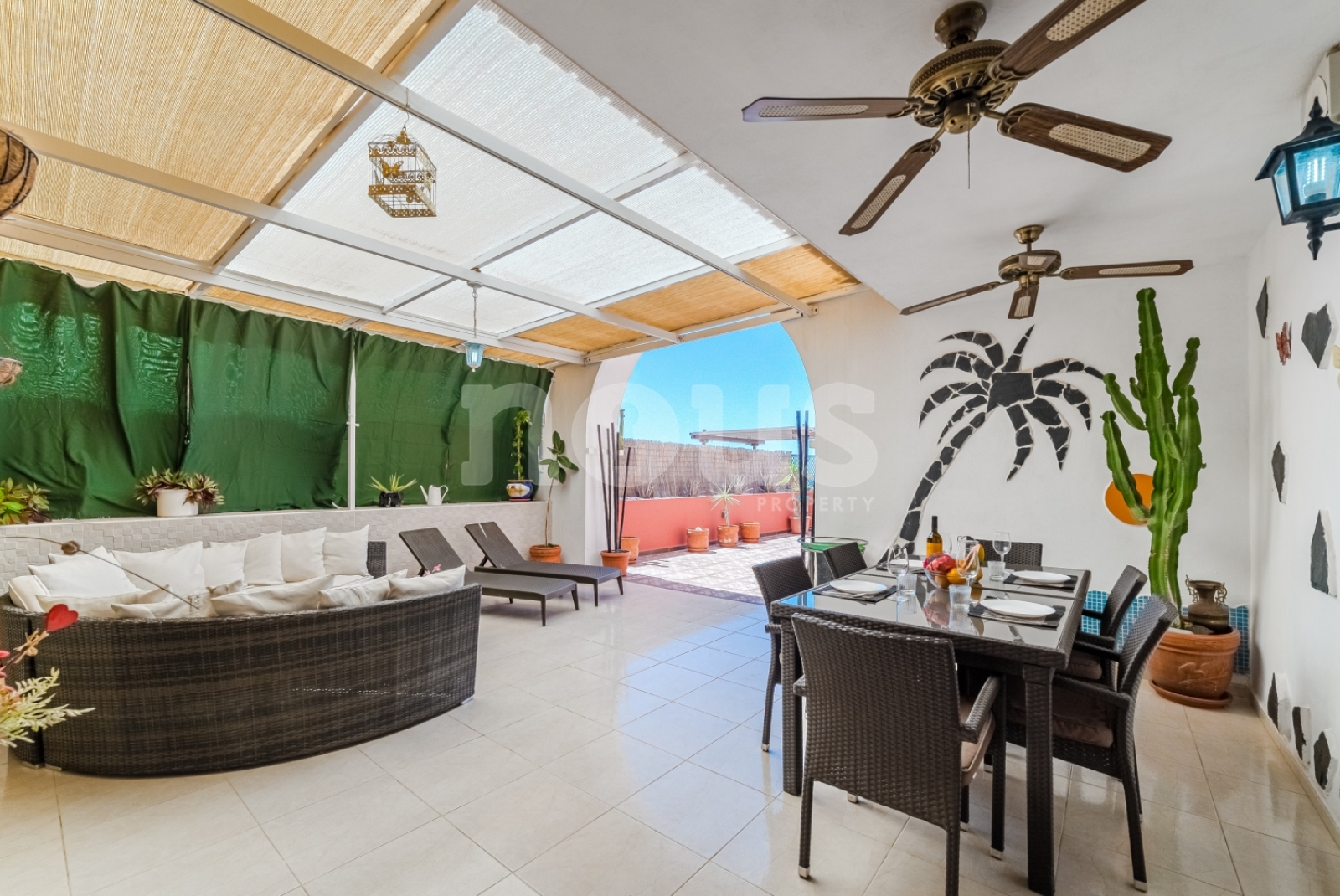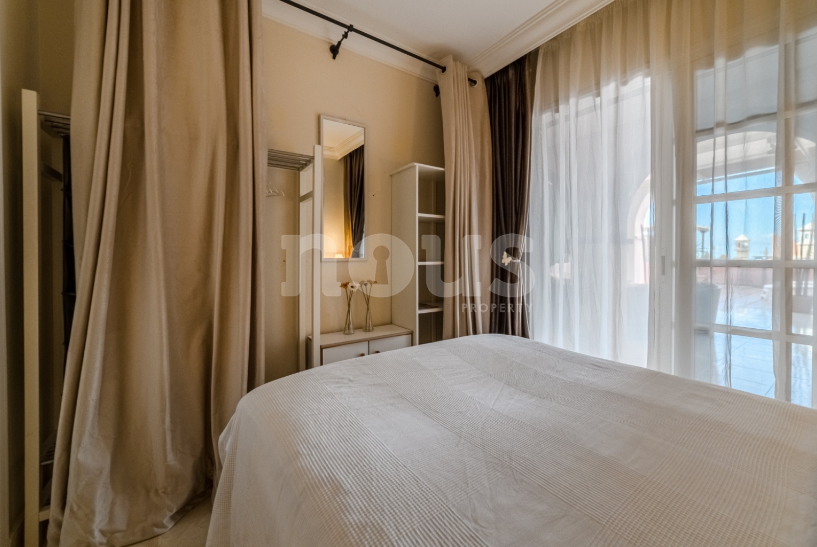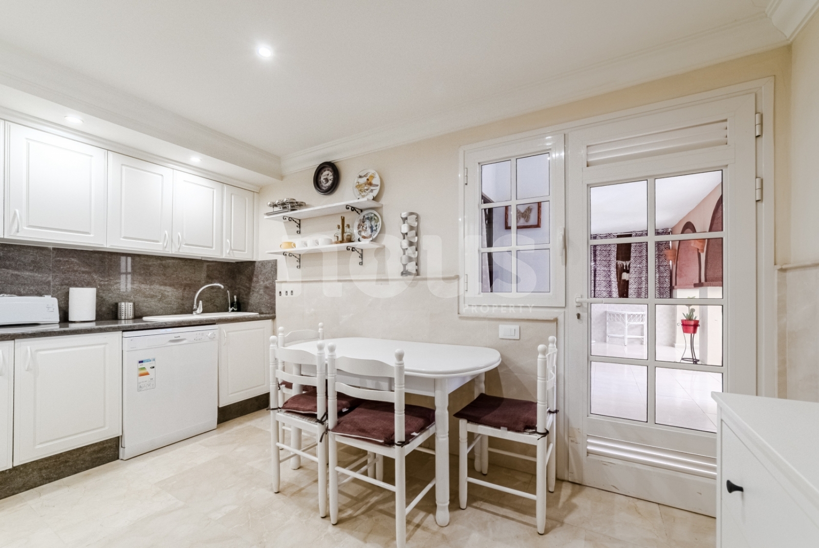 Descriptif détaillé de l'appartement : cuisine séparée, équipée en électroménager : cuisinière, four, bouilloire, cafetière, micro-onde, grille-pain, lave-vaisselle, réfrigérateur. Il y a des ustensiles pour cuisiner et manger. Salon confortable avec canapé et TV. Chambre principale avec lit double et salle de bain attenante avec baignoire. Deuxième chambre avec lit double. Deuxième salle de bain avec baignoire. Toutes les pièces de l'appartement ont accès à une grande terrasse avec un coin repas, un coin salon, des chaises longues.