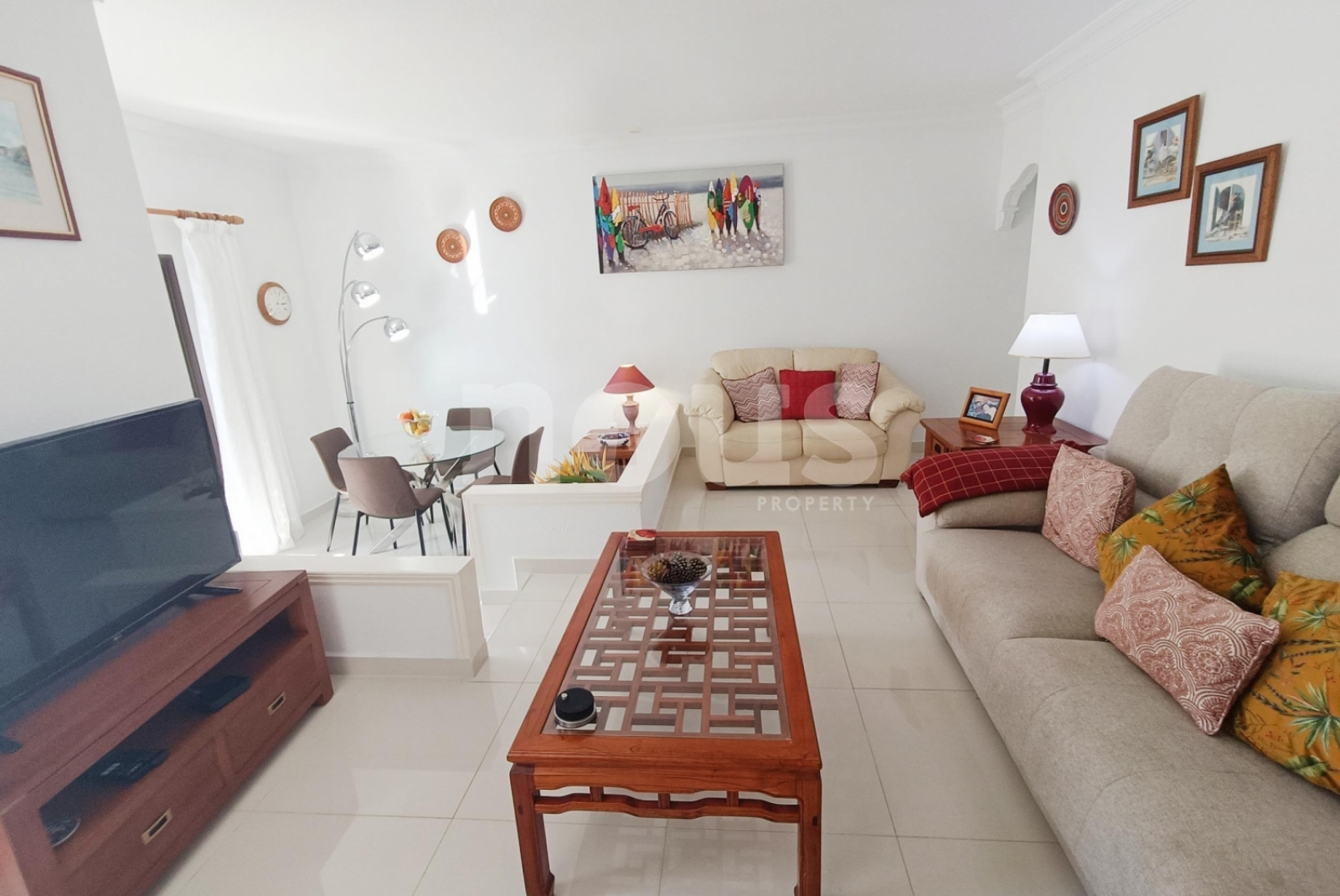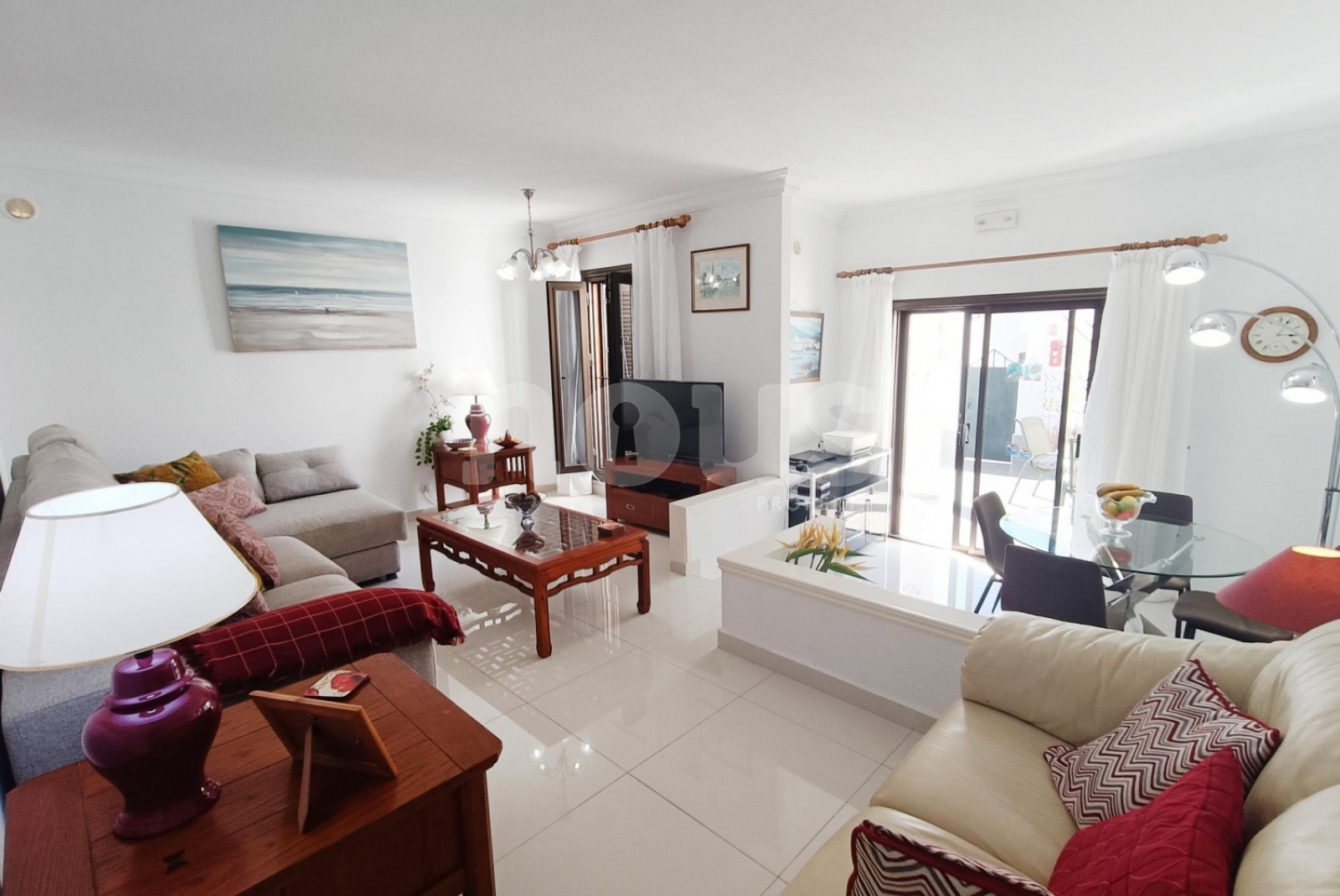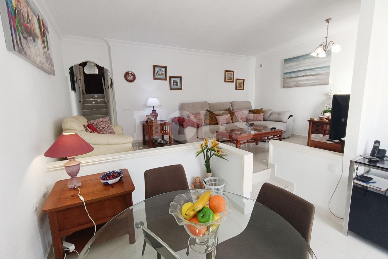 Le salon, à deux niveaux, offre un espace large et confortable, avec coin repas et sortie directe sur la terrasse principale, idéale pour profiter du temps de l'île. La cuisine est indépendante et a une vue sur le jardin. La maison a été renouvelée avec de nouveaux sols et des balustrades de verre modernes.