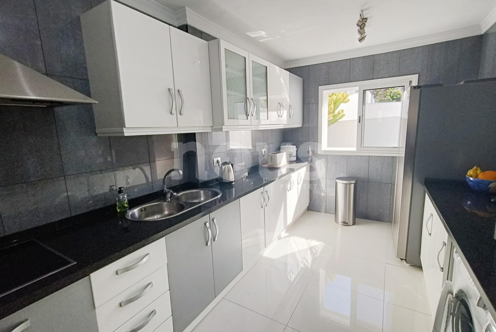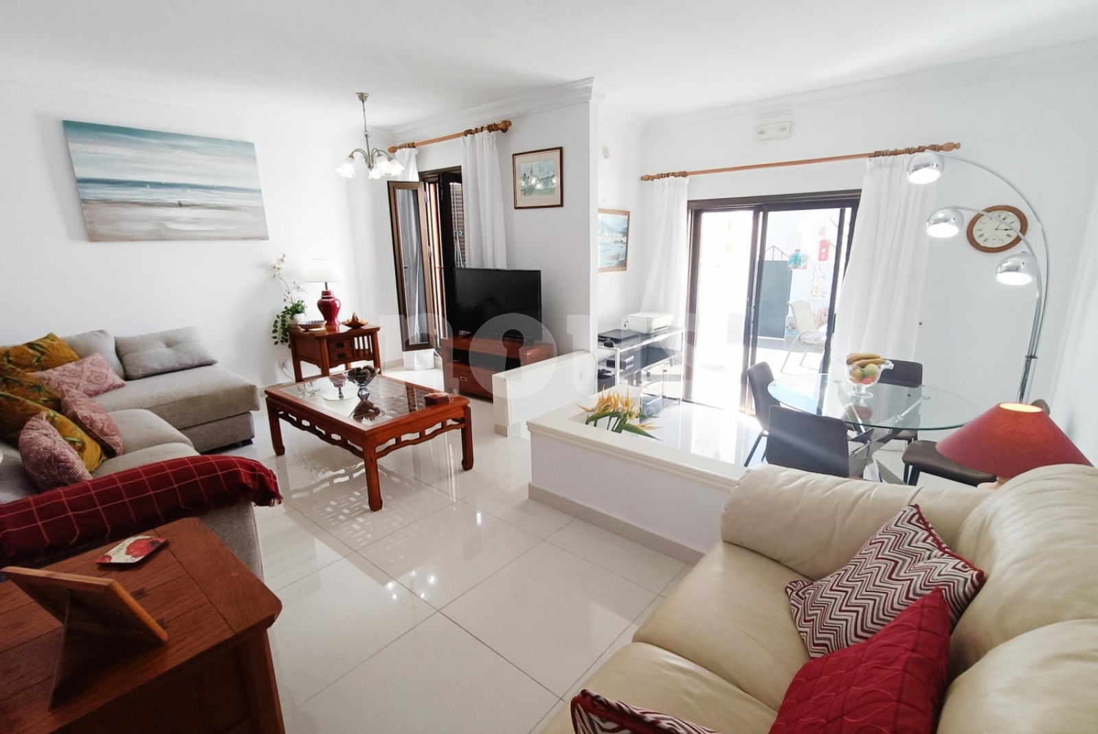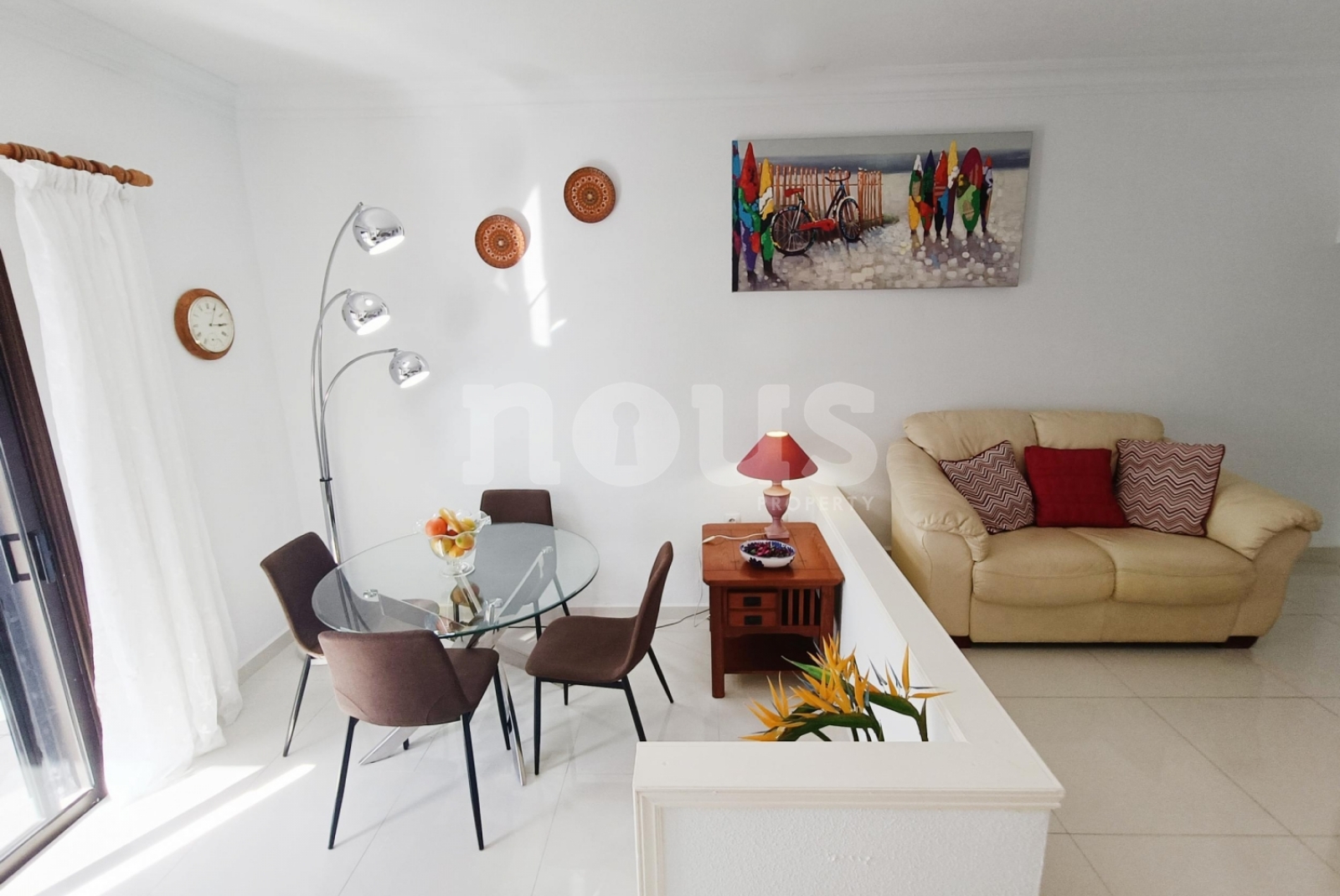Le salon, à deux niveaux, offre un espace large et confortable, avec coin repas et sortie directe sur la terrasse principale, idéale pour profiter du temps de l'île. La cuisine est indépendante et a une vue sur le jardin. La maison a été renouvelée avec de nouveaux sols et des balustrades de verre modernes.