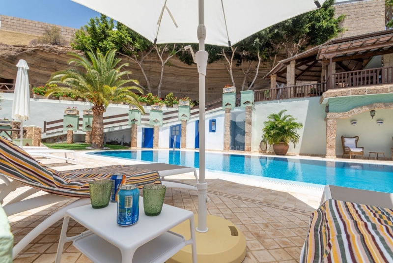 La villa offre des espaces de loisirs tels qu'une salle de sport privée avec sauna, une piscine entourée d'un solarium et un barbecue avec une cuisine complète, un four à bois et deux salles de bains, situés dans une grotte naturelle, créant un espace unique pour profiter. du plein air.