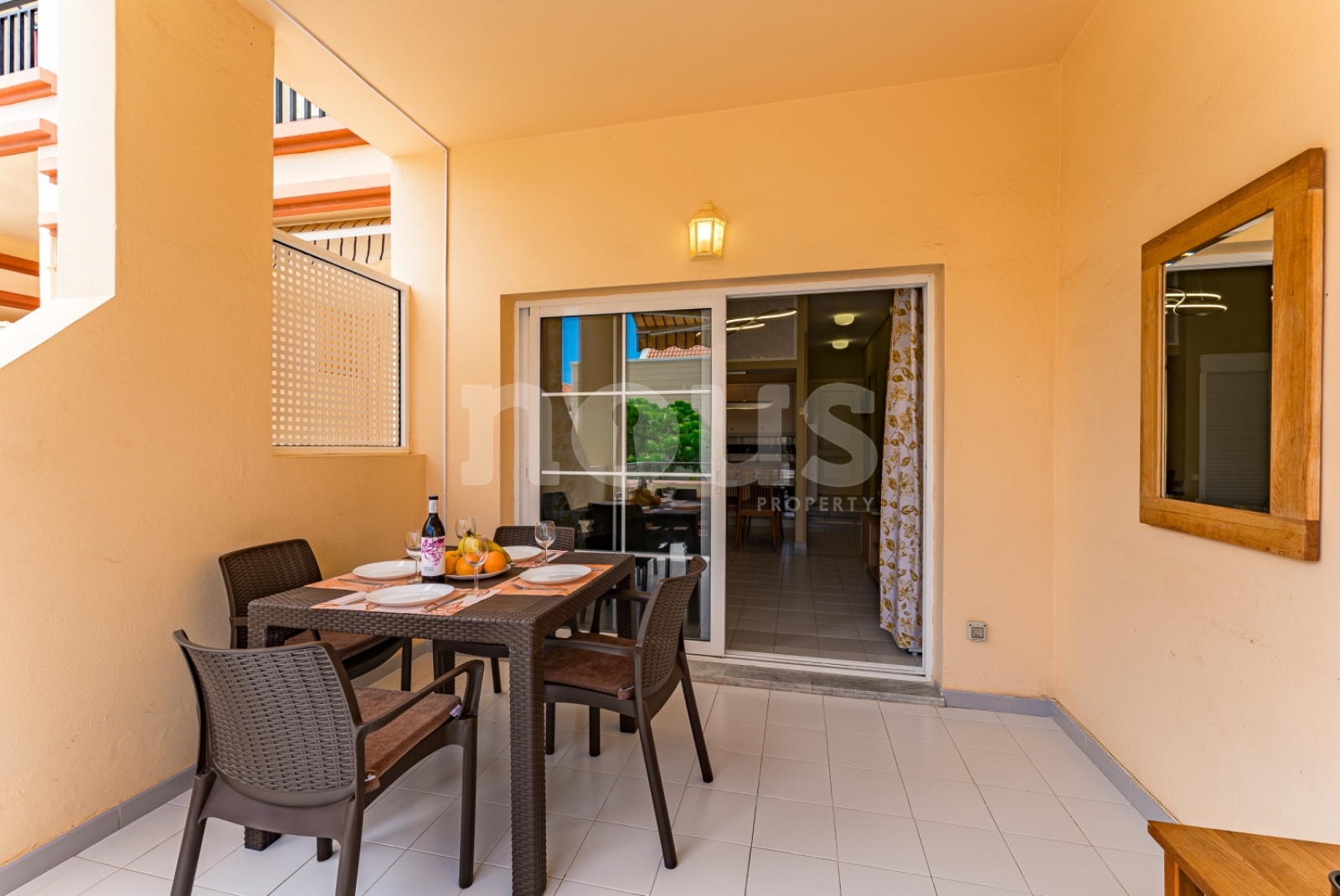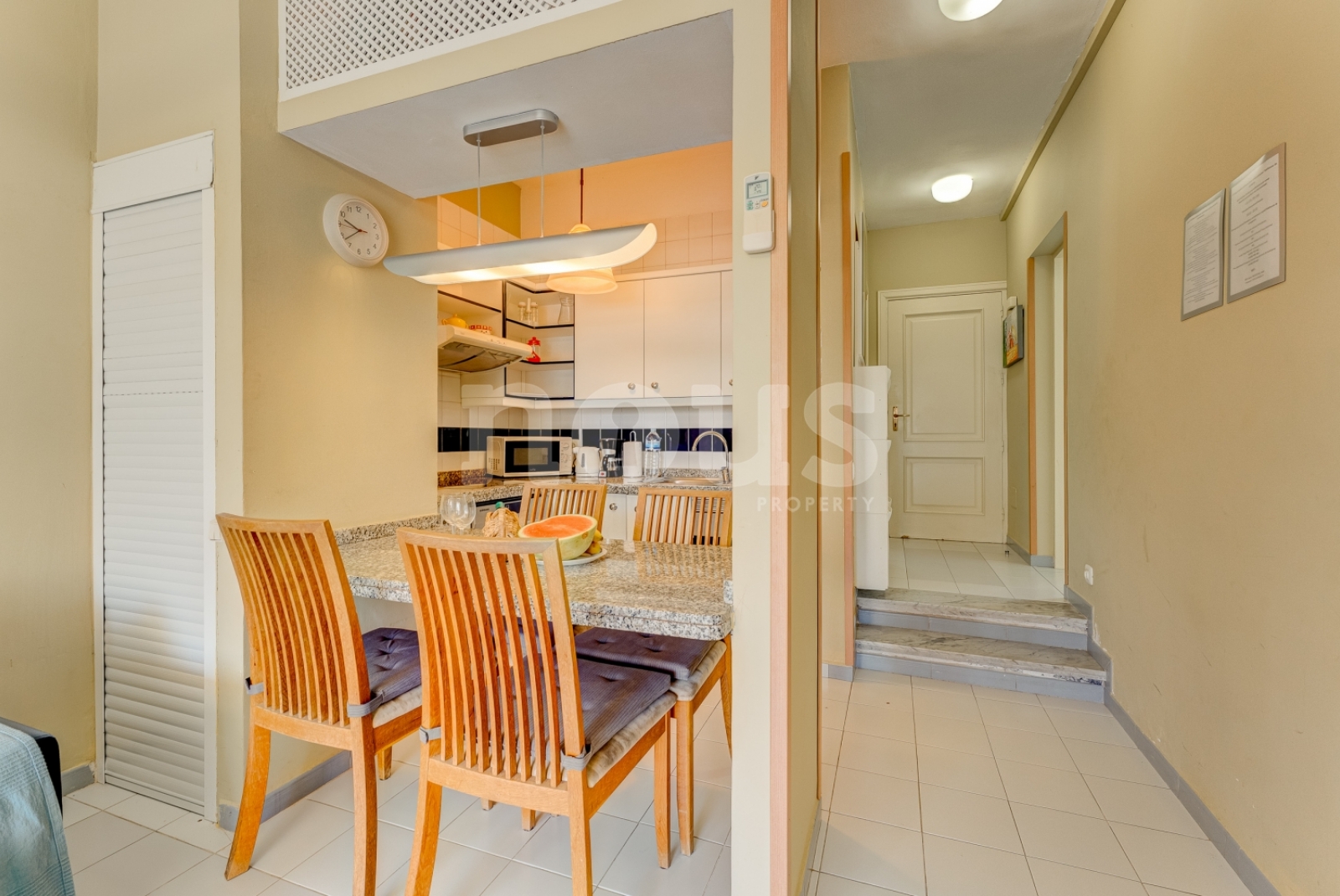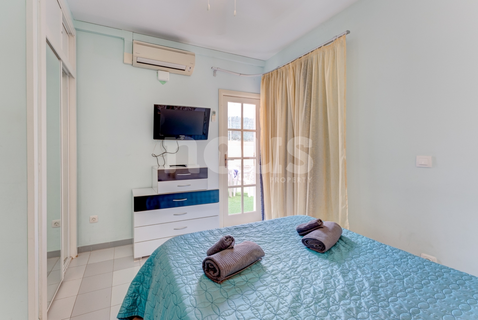 Descrizione dettagliata dell'appartamento: camera con letto matrimoniale e TV, bagno con vasca, cucina abbinata al soggiorno, attrezzata con elettrodomestici: piano cottura, forno, bollitore, microonde, frigorifero, lavastoviglie. Ci sono utensili per cucinare e mangiare. Il soggiorno ha un tavolo da pranzo, divano letto, TV. Terrazza con mobili (tavolo da pranzo e divano) con vista sulla piscina. C'è un cortile arredato.