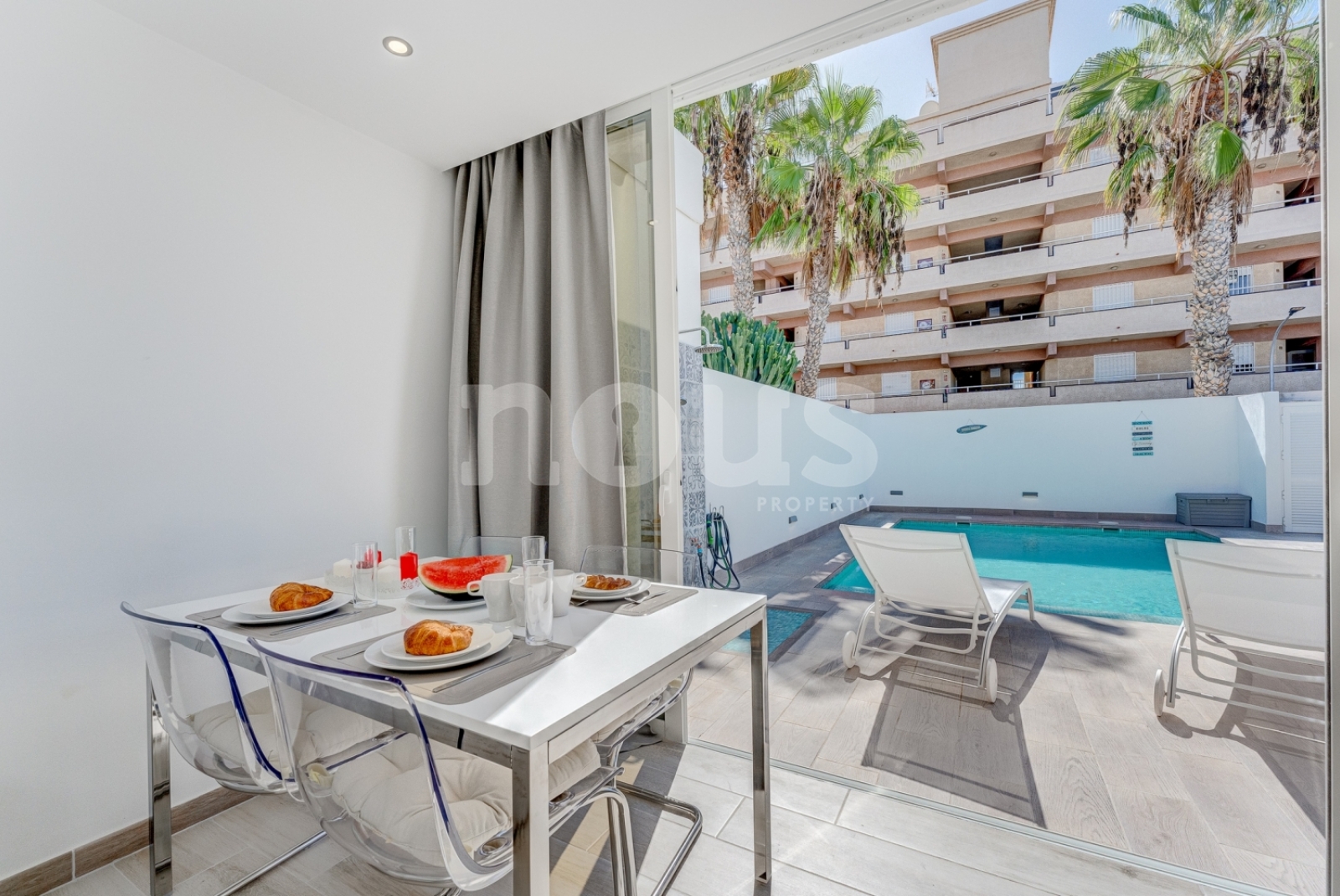 Uitgebreide omschrijving: ruime woonkamer met eettafel, bank en TV; de keuken, gecombineerd met de woonkamer, is uitgerust met huishoudelijke apparaten: fornuis, oven, waterkoker, koffiezetapparaat met capsules, broodrooster, magnetron, koelkast. Er zijn keukengerei om te koken en te eten. Hoofdslaapkamer met twee eenpersoonsbedden, tv en ensuite badkamer met douche. Tweede slaapkamer met stapelbed. Derde slaapkamer met tweepersoonsbed en TV. Tweede badkamer met douche. Het ruime terras is voorzien van meubilair, een eettafel, een zithoek, ligstoelen, een parasol, een zonneluifel, een buitendouche. Verwarmd privézwembad met beschermhoes.