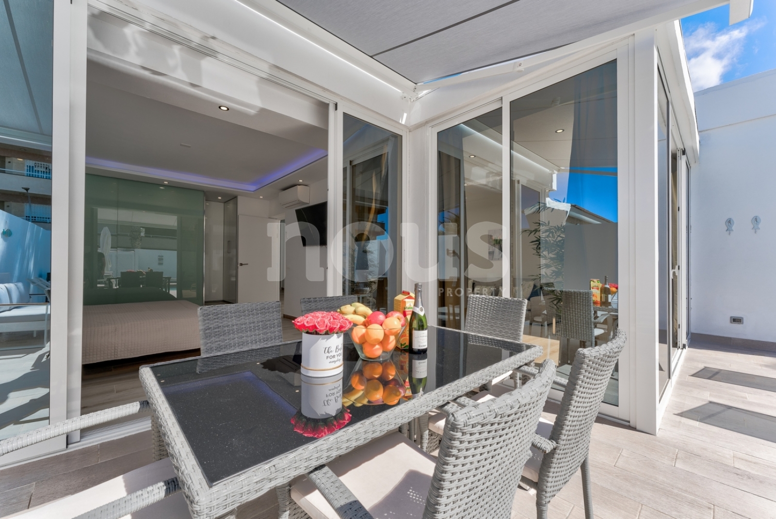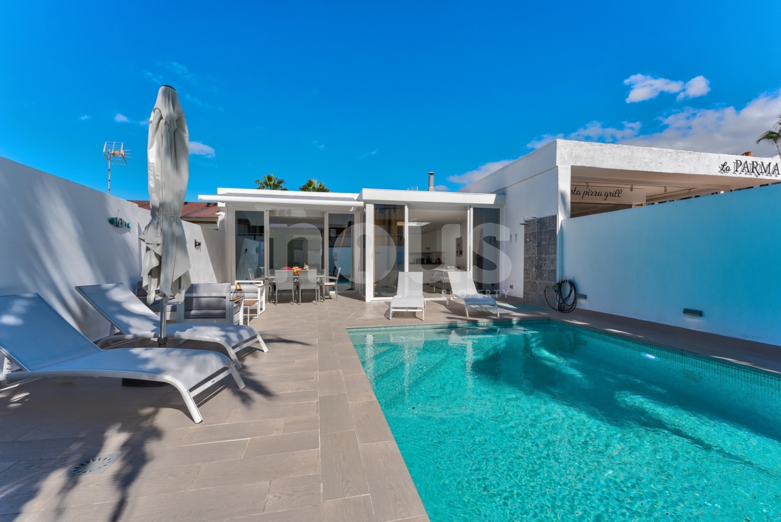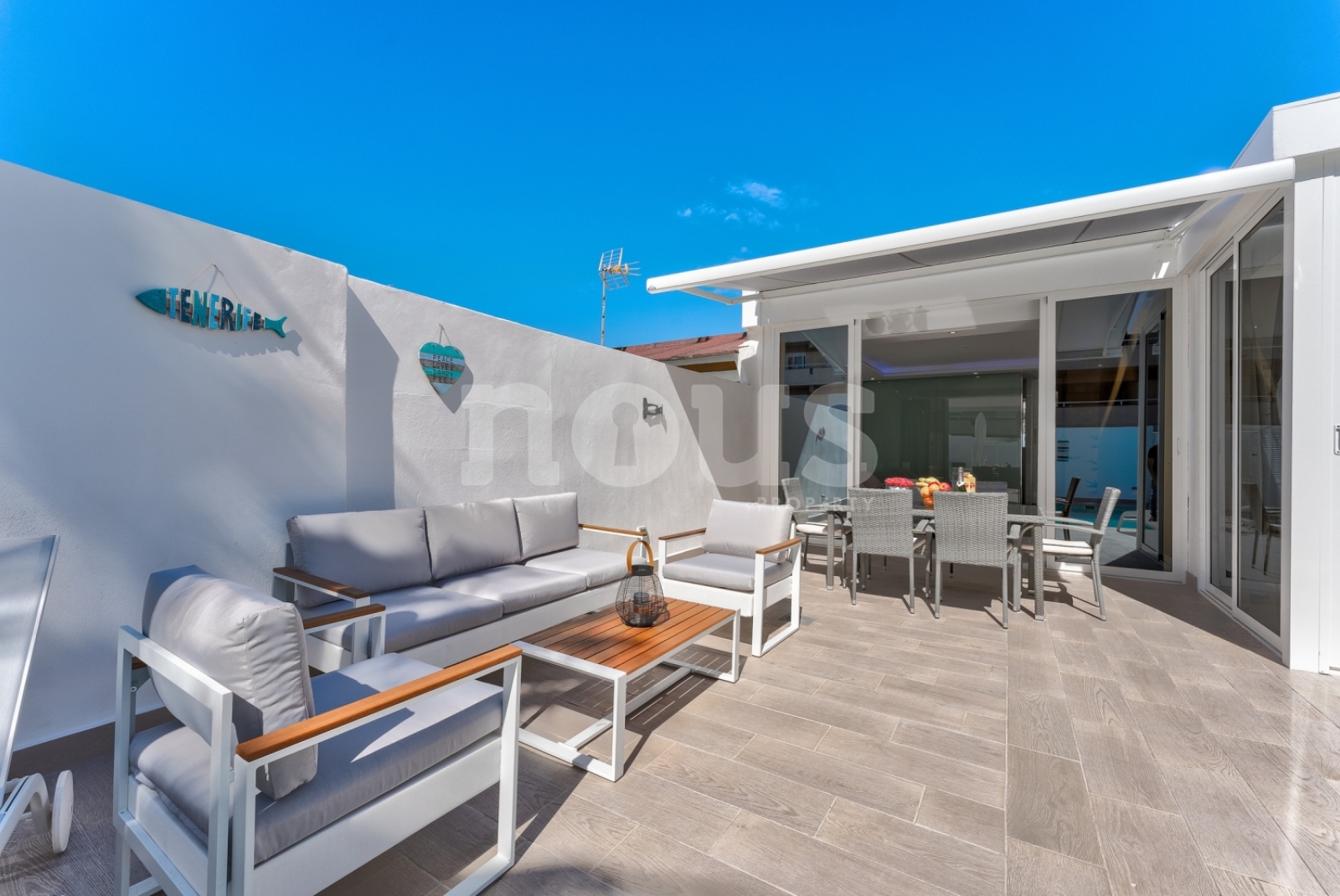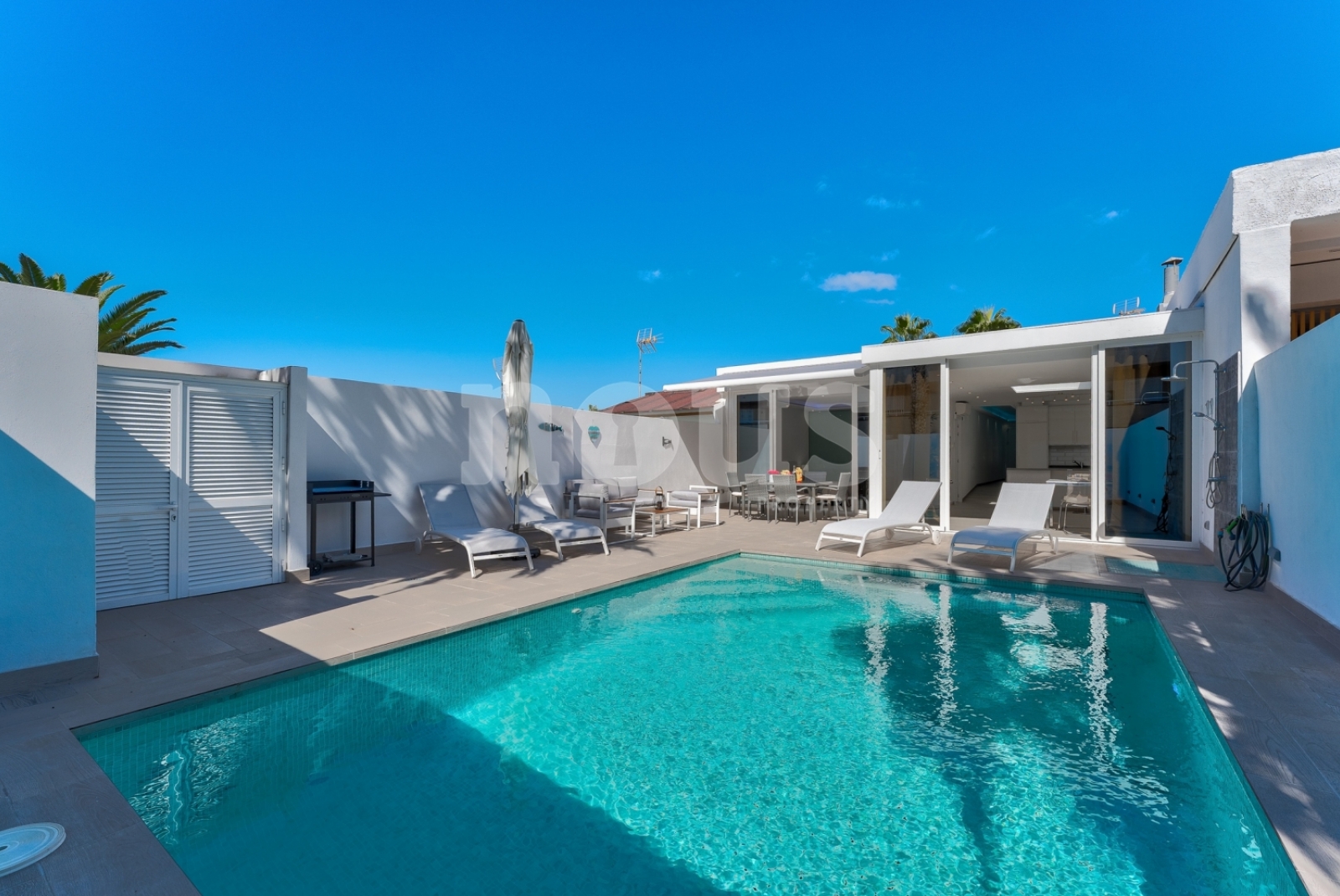 Nieuwe en moderne bungalow van één verdieping met 3 slaapkamers en een verwarmd privézwembad, gunstig gelegen in de stad Callao Salvaje in het zuiden van Tenerife in de urbanisatie Sol del Sur. De bungalow is geschikt voor maximaal 6 personen. Handige entree vanaf de straat zonder trappen. Er is een parkeerplaats op de open parkeerplaats.