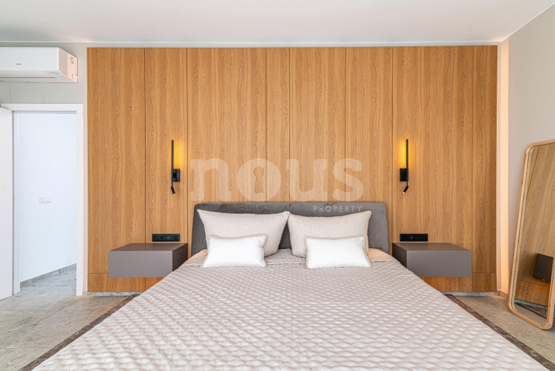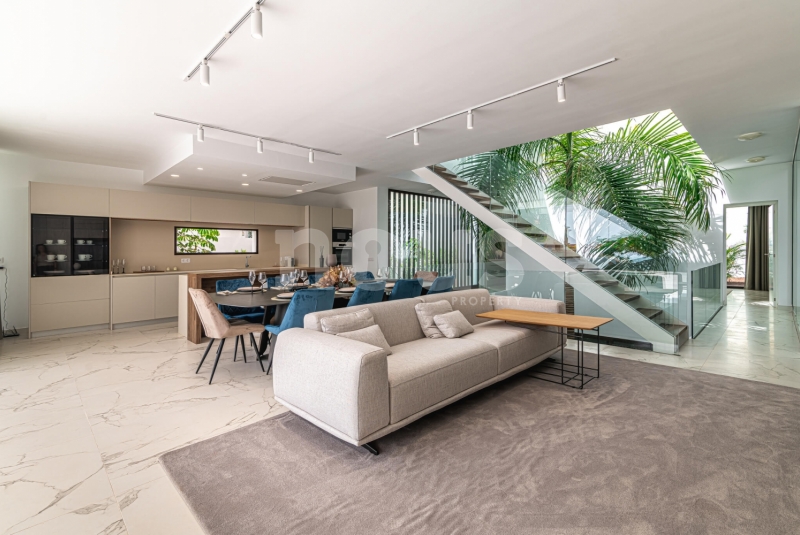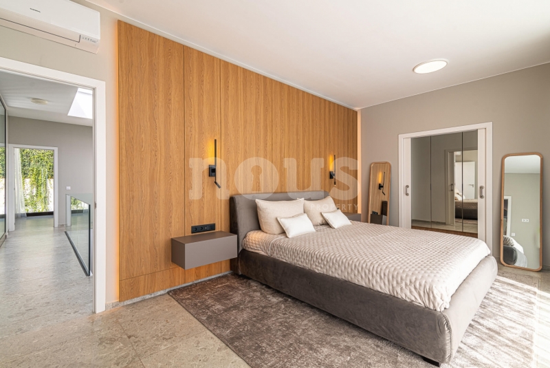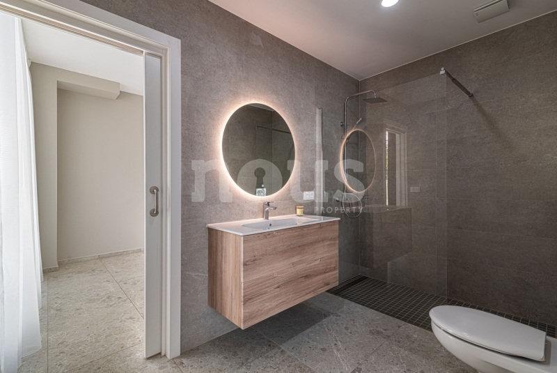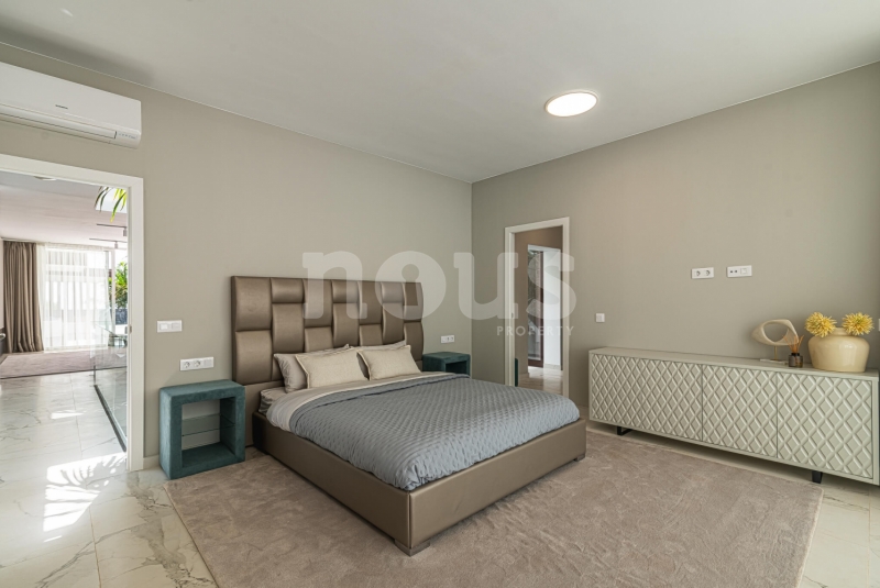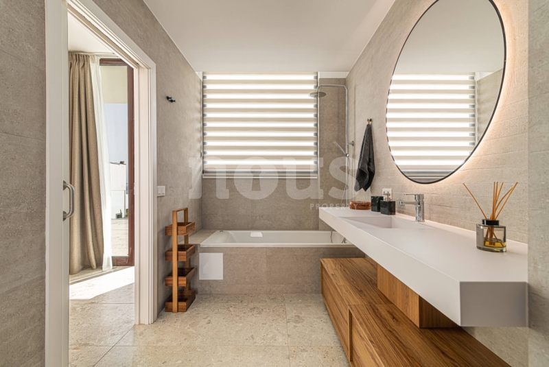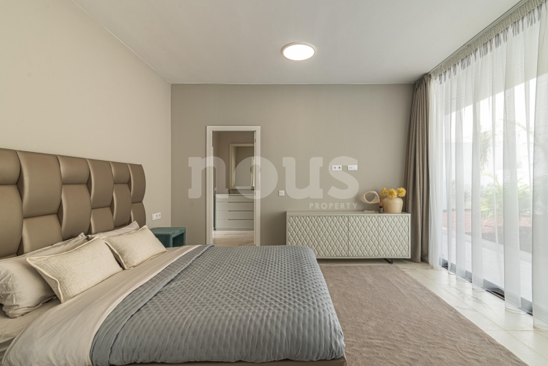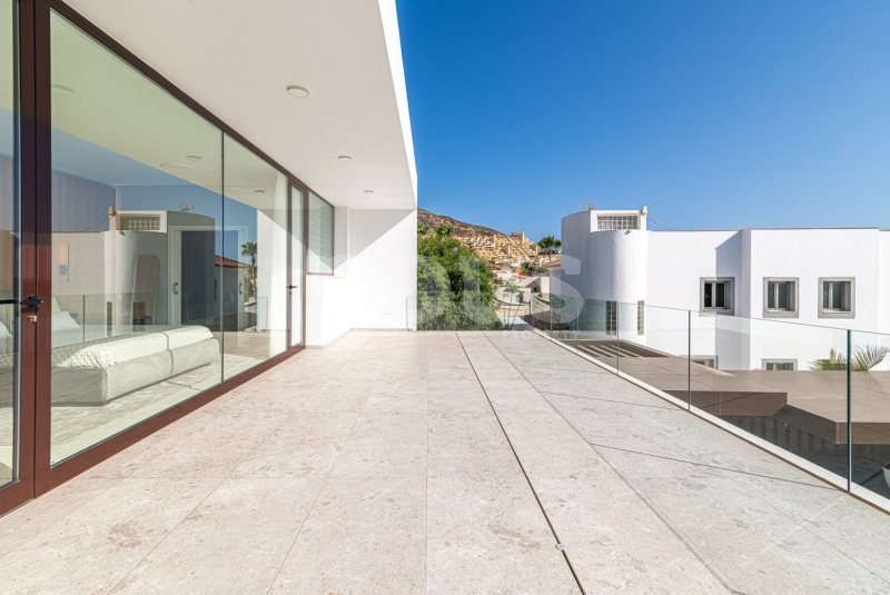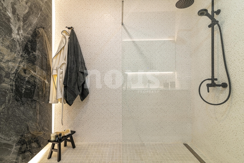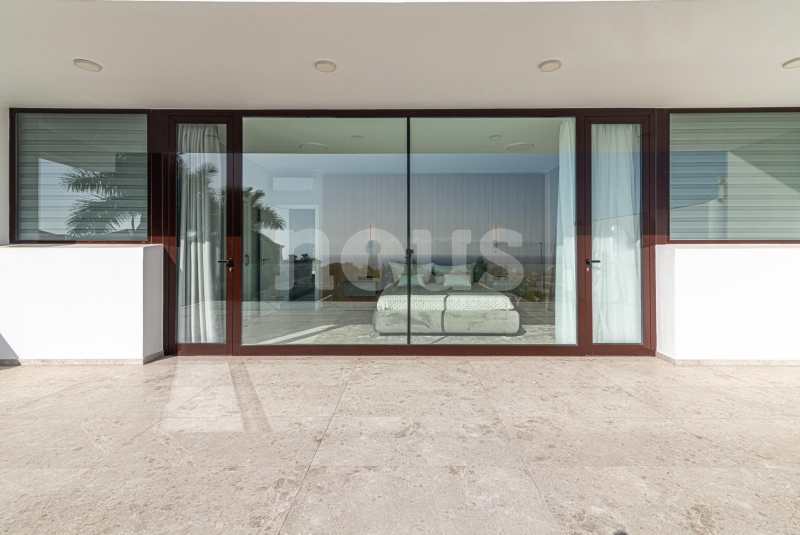 Op de bovenste verdieping van de villa bevindt zich de hoofdslaapkamer met een kleedkamer van 8,55 m² en een eigen badkamer van 6,85 m². Daarnaast zijn er twee extra slaapkamers van elk 9,90 m² en een gedeelde badkamer van 5,80 m². De buitenkant van deze verdieping omvat een terras van 24,50 m² en een veranda van 14,55 m², evenals een tweede terras van 8,30 m², vanwaar u gedeeltelijk uitzicht op de zee heeft.