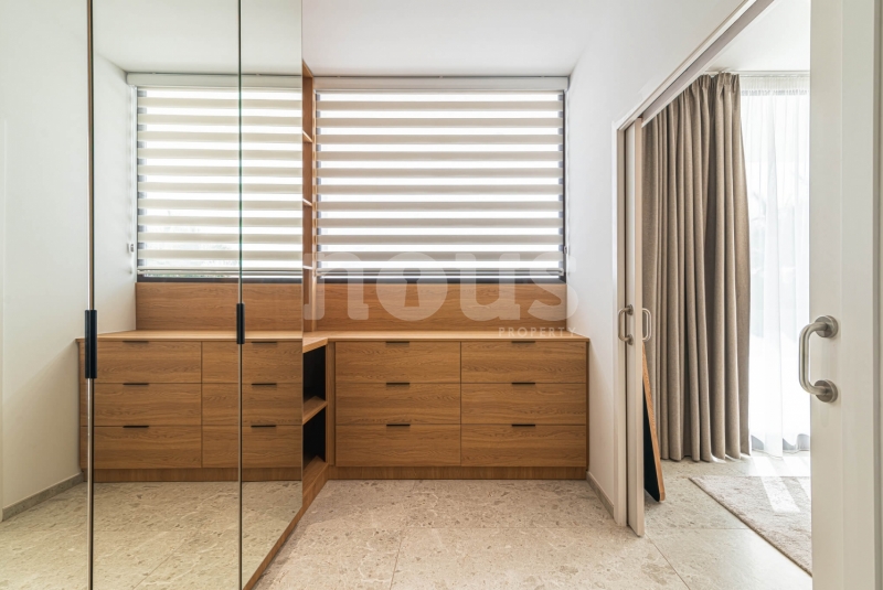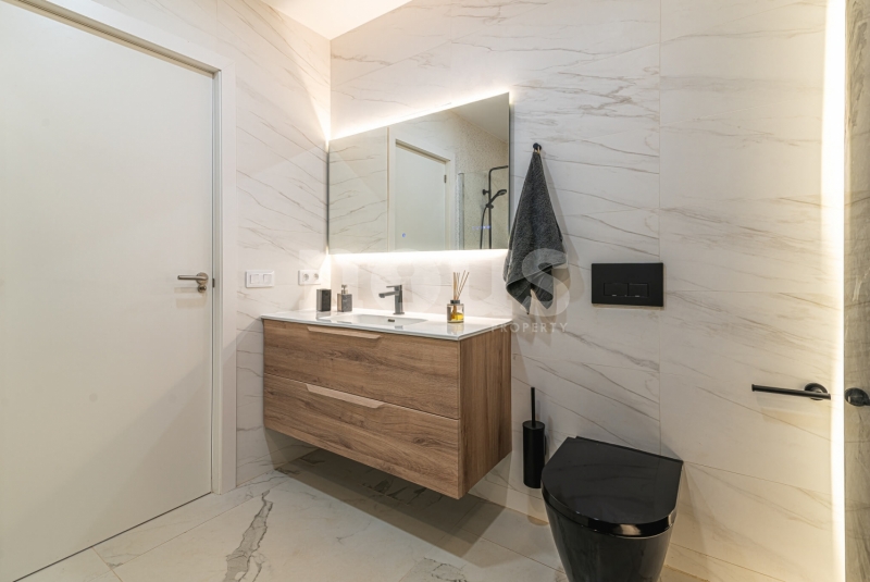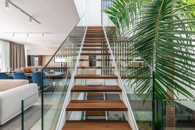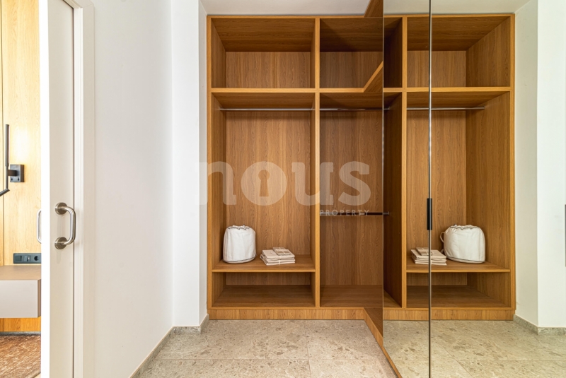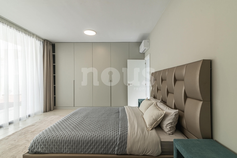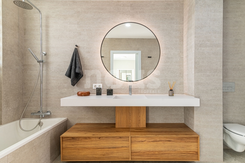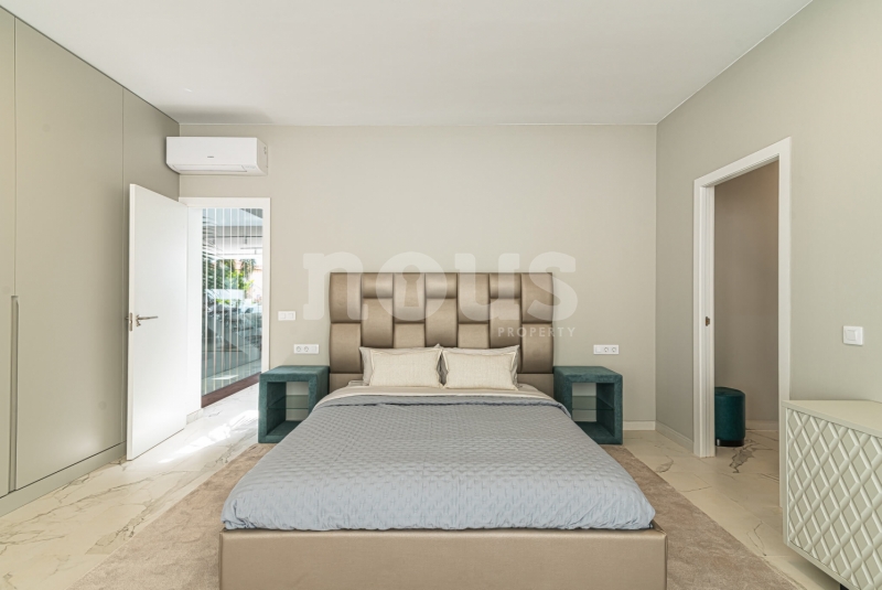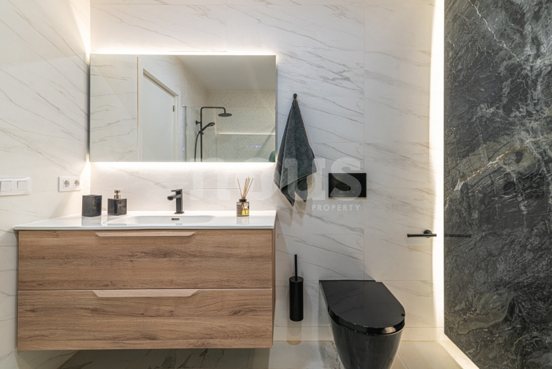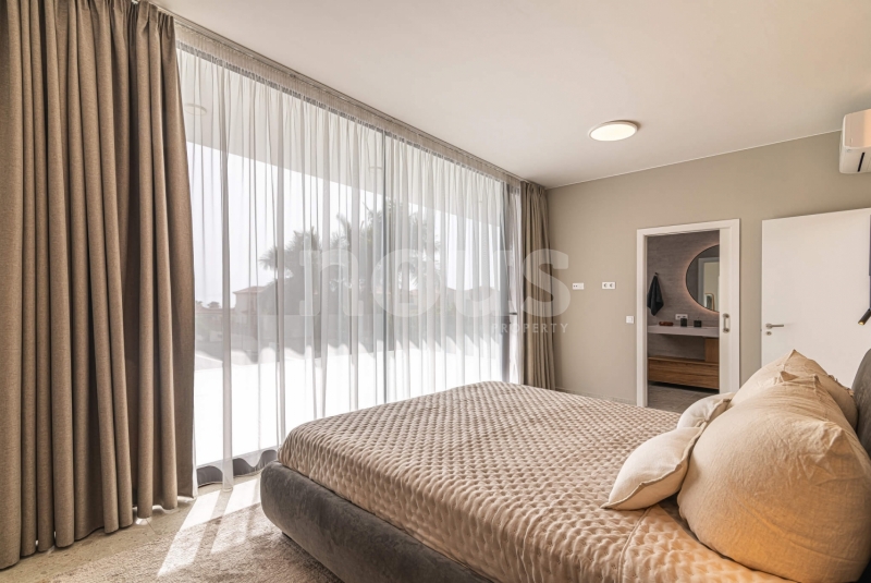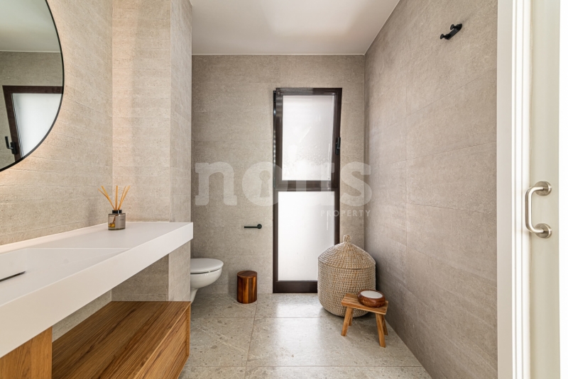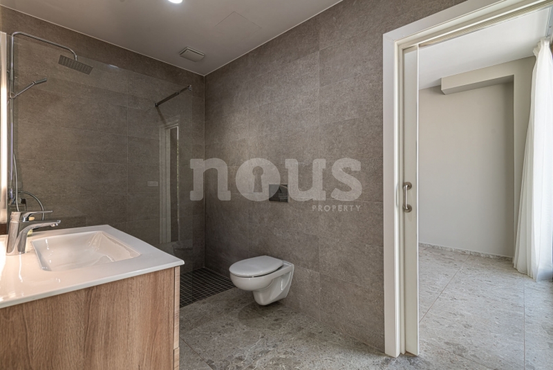 Op de bovenste verdieping van de villa bevindt zich de hoofdslaapkamer met een kleedkamer van 8,55 m² en een eigen badkamer van 6,85 m². Daarnaast zijn er twee extra slaapkamers van elk 9,90 m² en een gedeelde badkamer van 5,80 m². De buitenkant van deze verdieping omvat een terras van 24,50 m² en een veranda van 14,55 m², evenals een tweede terras van 8,30 m², vanwaar u gedeeltelijk uitzicht op de zee heeft.
