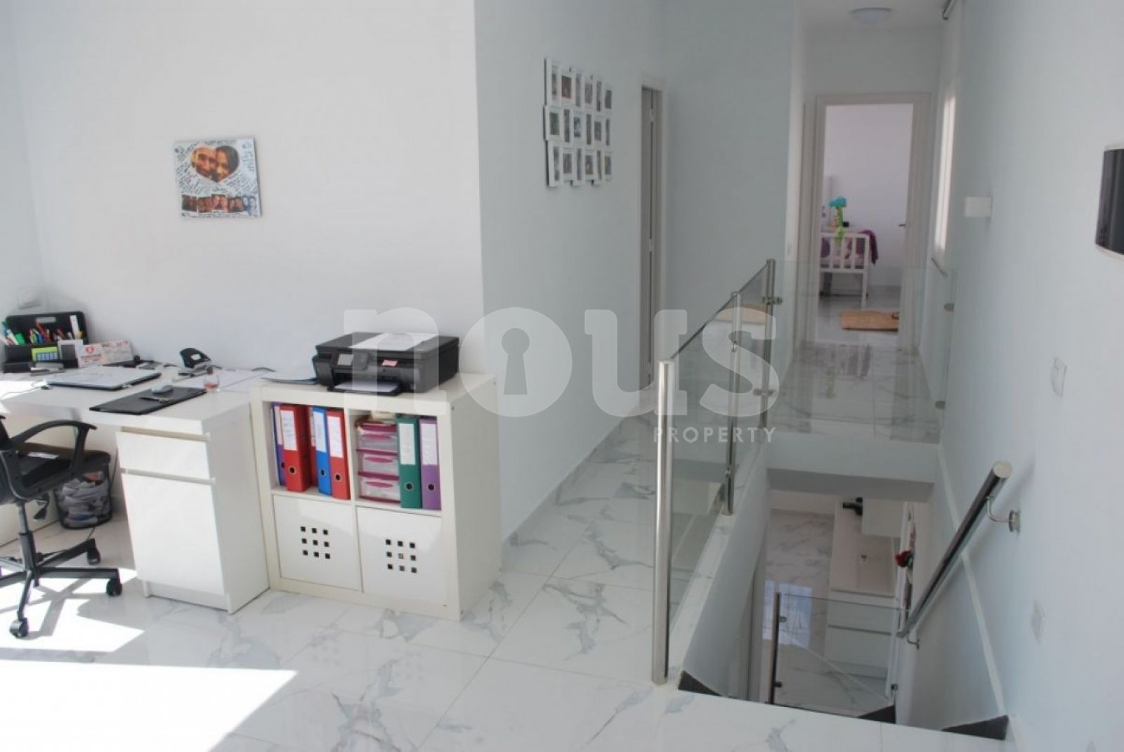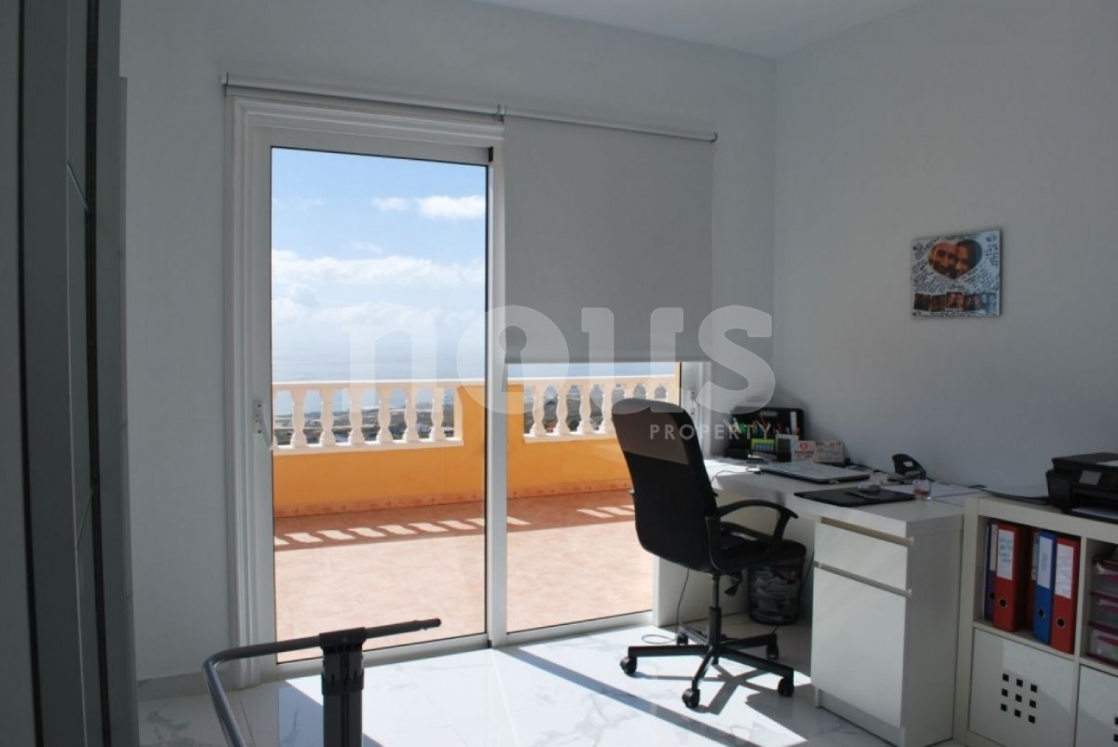 > De bovenste verdieping heeft een kantoor met toegang tot een groot terras met uitzicht op de berg en de zee, een kleedkamer, een badkamer met douche en een grote slaapkamer met toegang tot het terras en uitzicht op de zee.