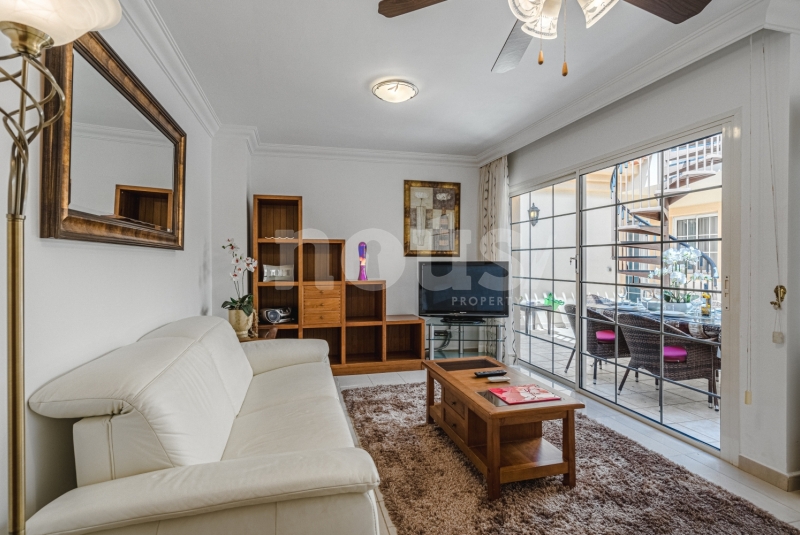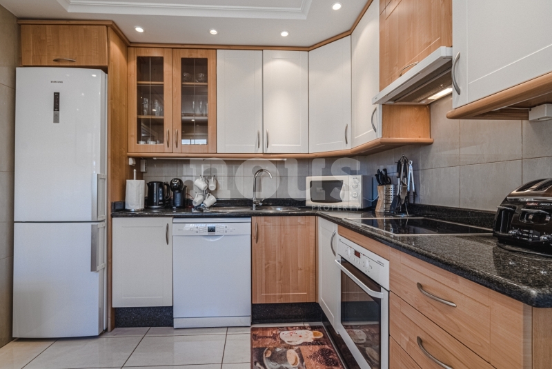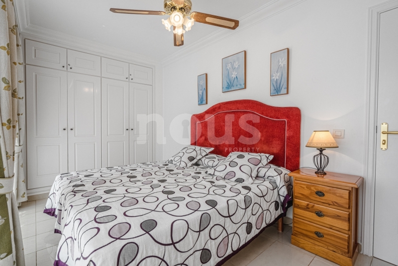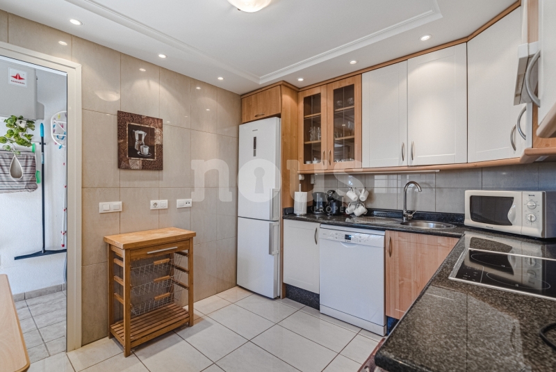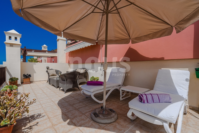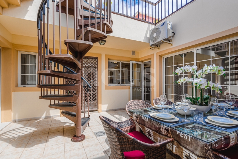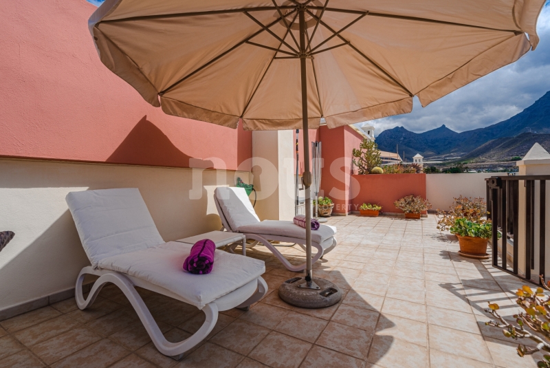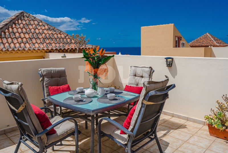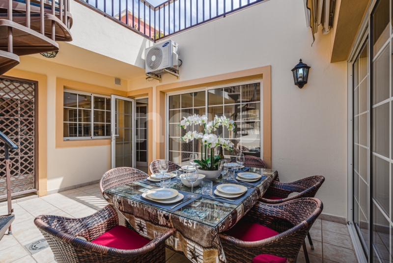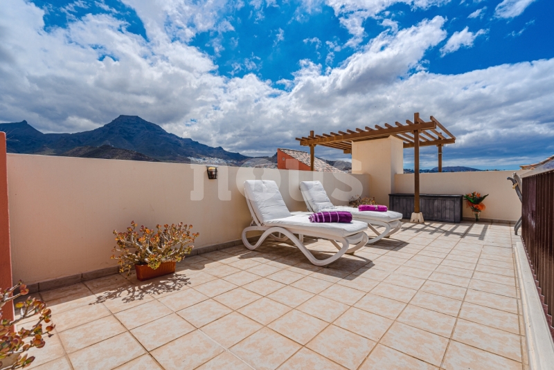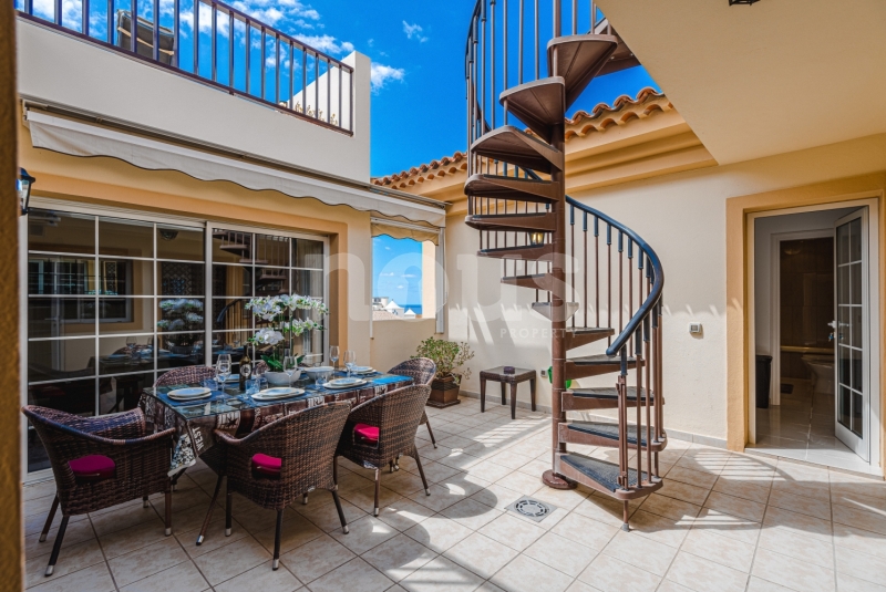 Szczegółowy opis mieszkania: na parterze: oddzielna kuchnia, wyposażona w sprzęt AGD: kuchenka, piekarnik, czajnik, ekspres na kapsułki, mikrofalówka, sokowirówka, toster, zmywarka, lodówka. Są naczynia do gotowania i jedzenia. Kuchnia połączona jest z małym pomieszczeniem gospodarczym z pralką, suszarką, odkurzaczem. W salonie znajdują się 2 sofy z mechanizmem rozkładania umożliwiającym zmianę położenia oparcia i podnóżków; jest telewizor. Sypialnia z podwójnym łóżkiem i łazienką z prysznicem. Druga sypialnia z podwójnym łóżkiem. Druga łazienka z wanną. Wszystkie pokoje w apartamencie mają dostęp do patio-tarasu ze stołem jadalnym. Spiralnymi schodami wchodzimy na górny taras solarium z panoramicznym widokiem na ocean i góry. Na tarasie znajdują się leżaki, meble, część wypoczynkowa, prysznic, parasol, daszek.