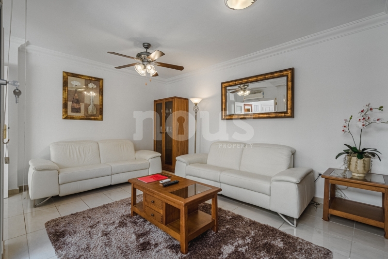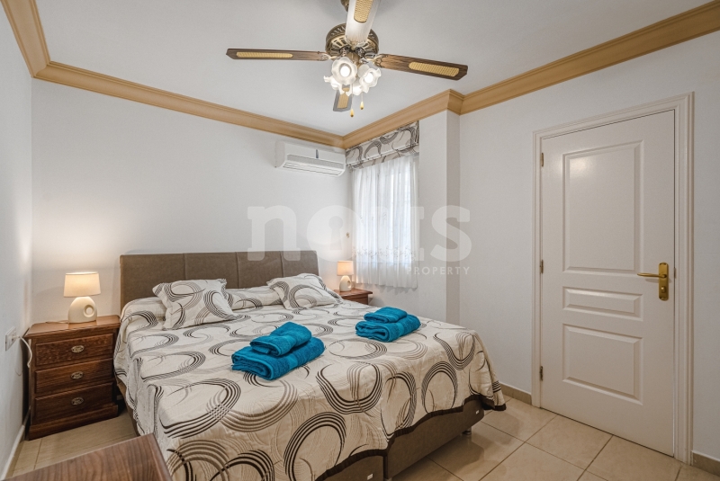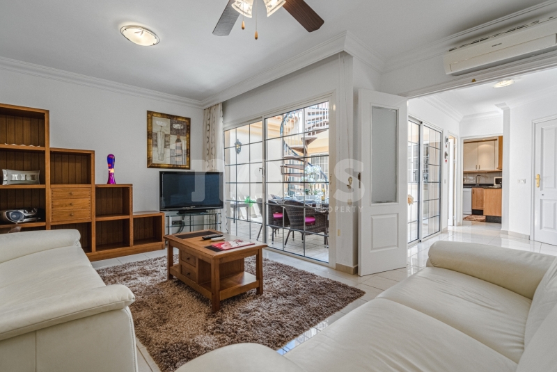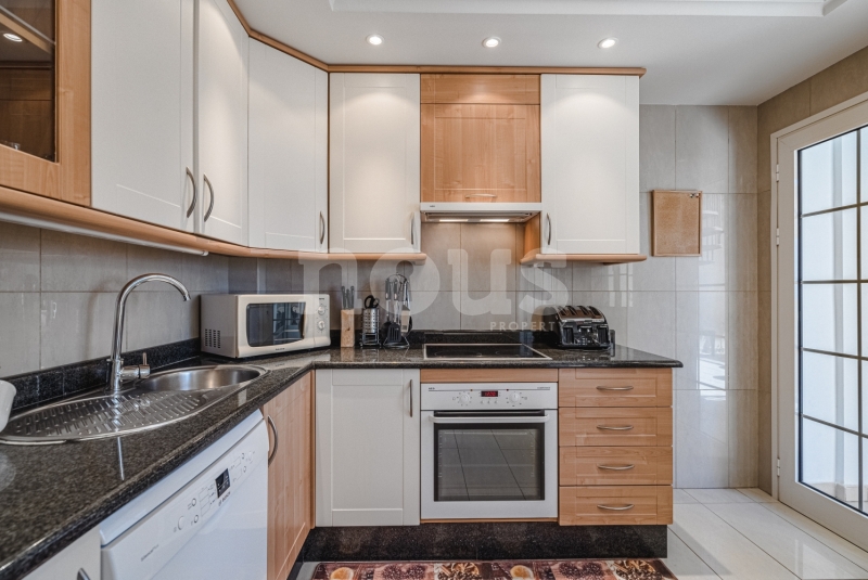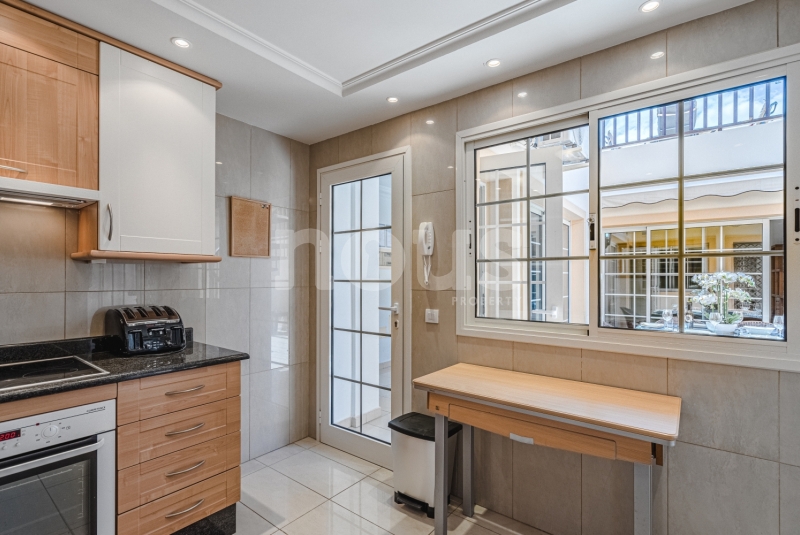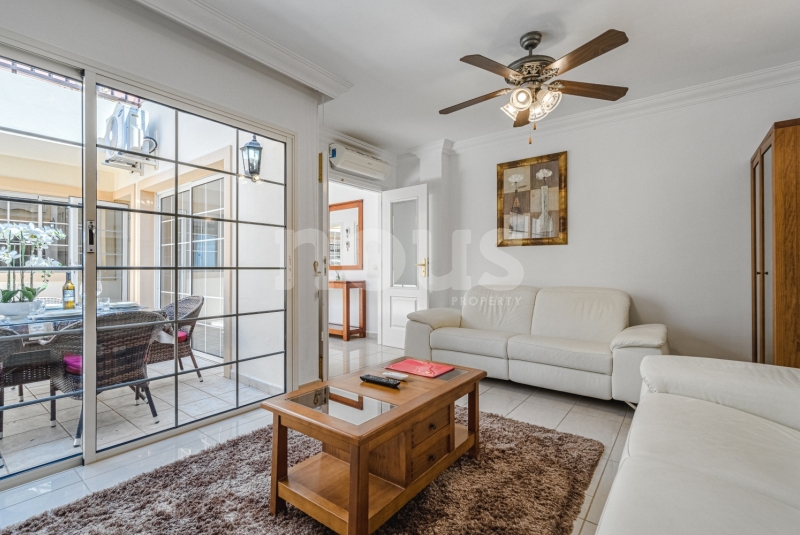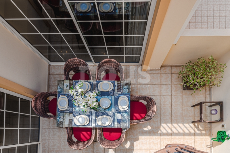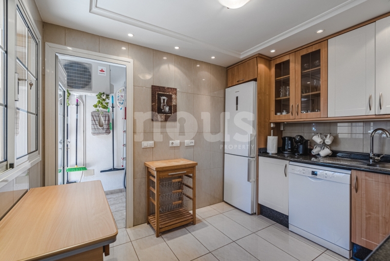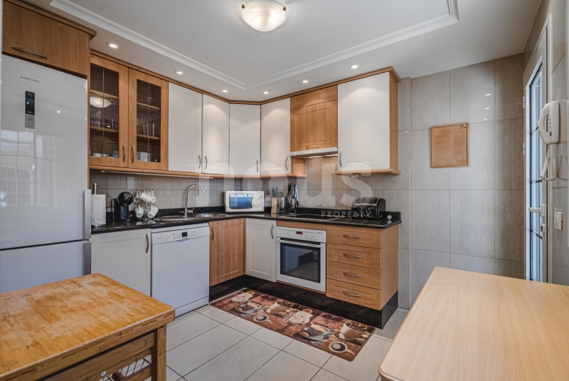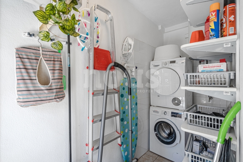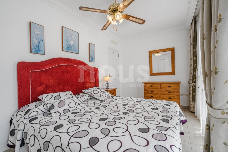 Szczegółowy opis mieszkania: na parterze: oddzielna kuchnia, wyposażona w sprzęt AGD: kuchenka, piekarnik, czajnik, ekspres na kapsułki, mikrofalówka, sokowirówka, toster, zmywarka, lodówka. Są naczynia do gotowania i jedzenia. Kuchnia połączona jest z małym pomieszczeniem gospodarczym z pralką, suszarką, odkurzaczem. W salonie znajdują się 2 sofy z mechanizmem rozkładania umożliwiającym zmianę położenia oparcia i podnóżków; jest telewizor. Sypialnia z podwójnym łóżkiem i łazienką z prysznicem. Druga sypialnia z podwójnym łóżkiem. Druga łazienka z wanną. Wszystkie pokoje w apartamencie mają dostęp do patio-tarasu ze stołem jadalnym. Spiralnymi schodami wchodzimy na górny taras solarium z panoramicznym widokiem na ocean i góry. Na tarasie znajdują się leżaki, meble, część wypoczynkowa, prysznic, parasol, daszek.