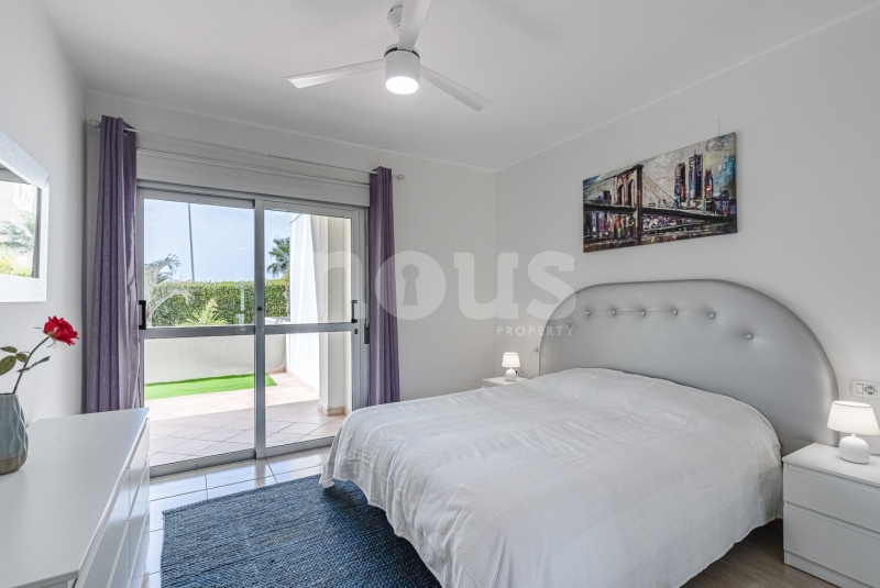 Szczegółowy opis mieszkania: kuchnia połączona z salonem wyposażona jest w sprzęt AGD: kuchenka, piekarnik, czajnik, ekspres do kawy na kapsułki, mikrofalówka, toster, zmywarka, lodówka, stół jadalny. Są przybory do gotowania i jedzenia. W salonie znajduje się wygodna sofa i telewizor. Taras ze stołem jadalnym i przestronny dziedziniec z częścią wypoczynkową z dostępem do kompleksu i basenu. 2 sypialnie dwuosobowe. Łazienka z wanną.