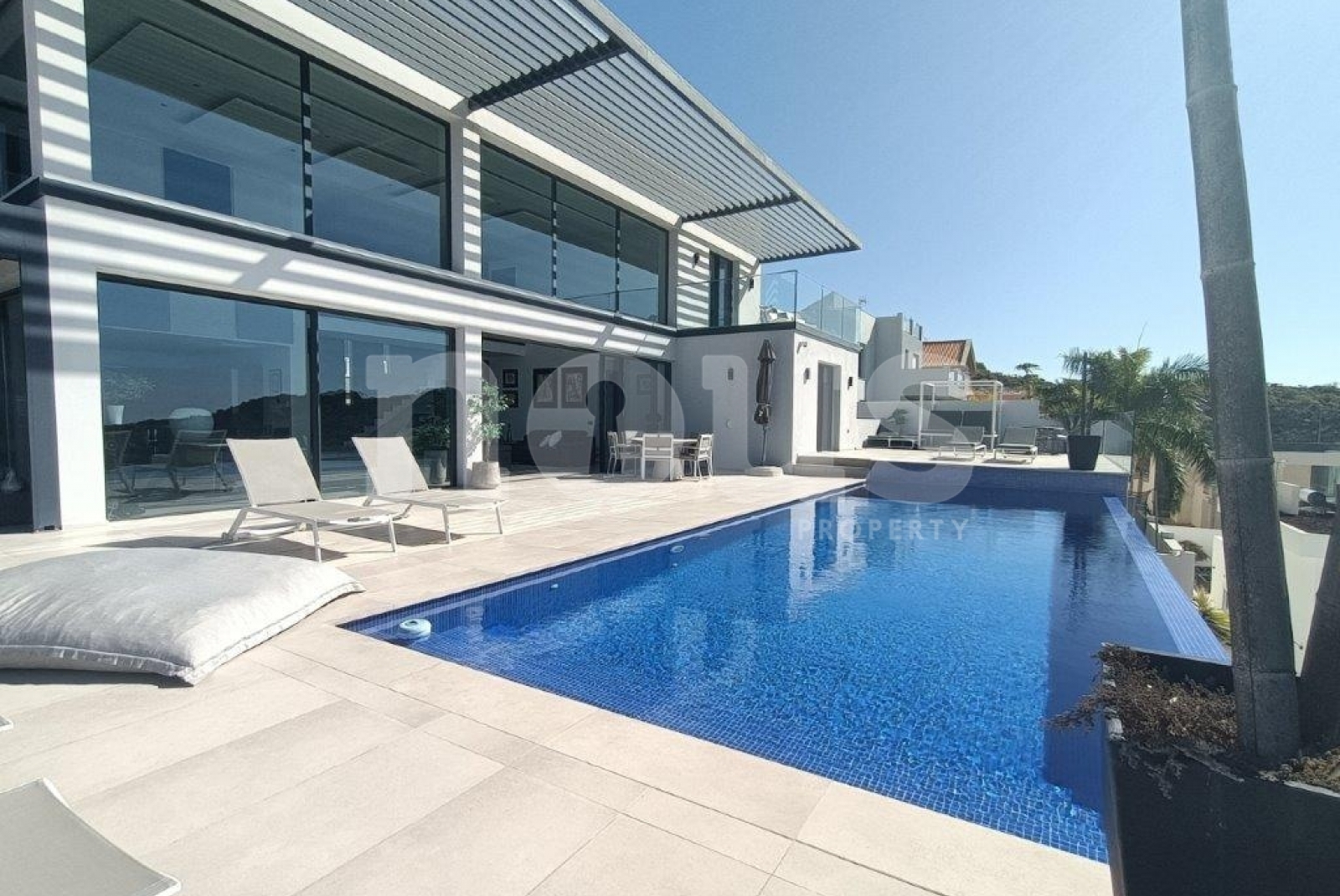 Снаружи есть несколько зон для загара, открытая развлекательная зона с баром и креслами, которые можно закрыть электрическими жалюзи, и, конечно же, замечательный пейзажный бассейн с подогревом.
